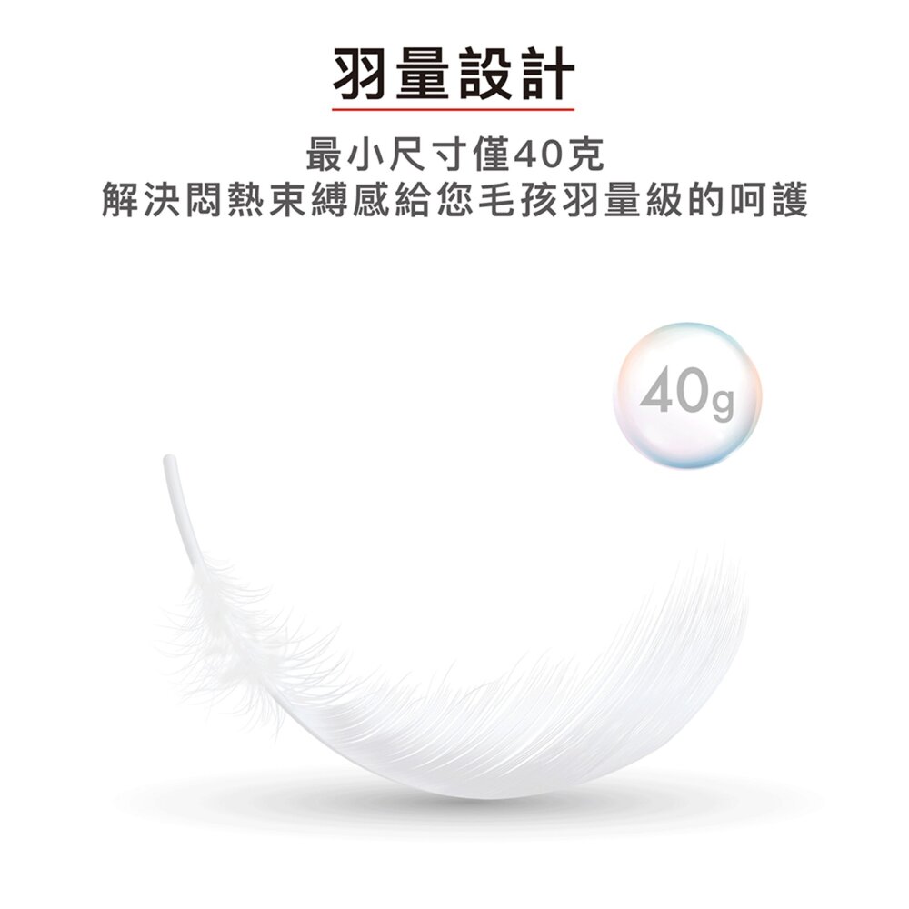 極度輕量,最小尺寸不到50公克,讓狗狗外出穿戴時非常輕鬆不累贅,並且堅固耐用。