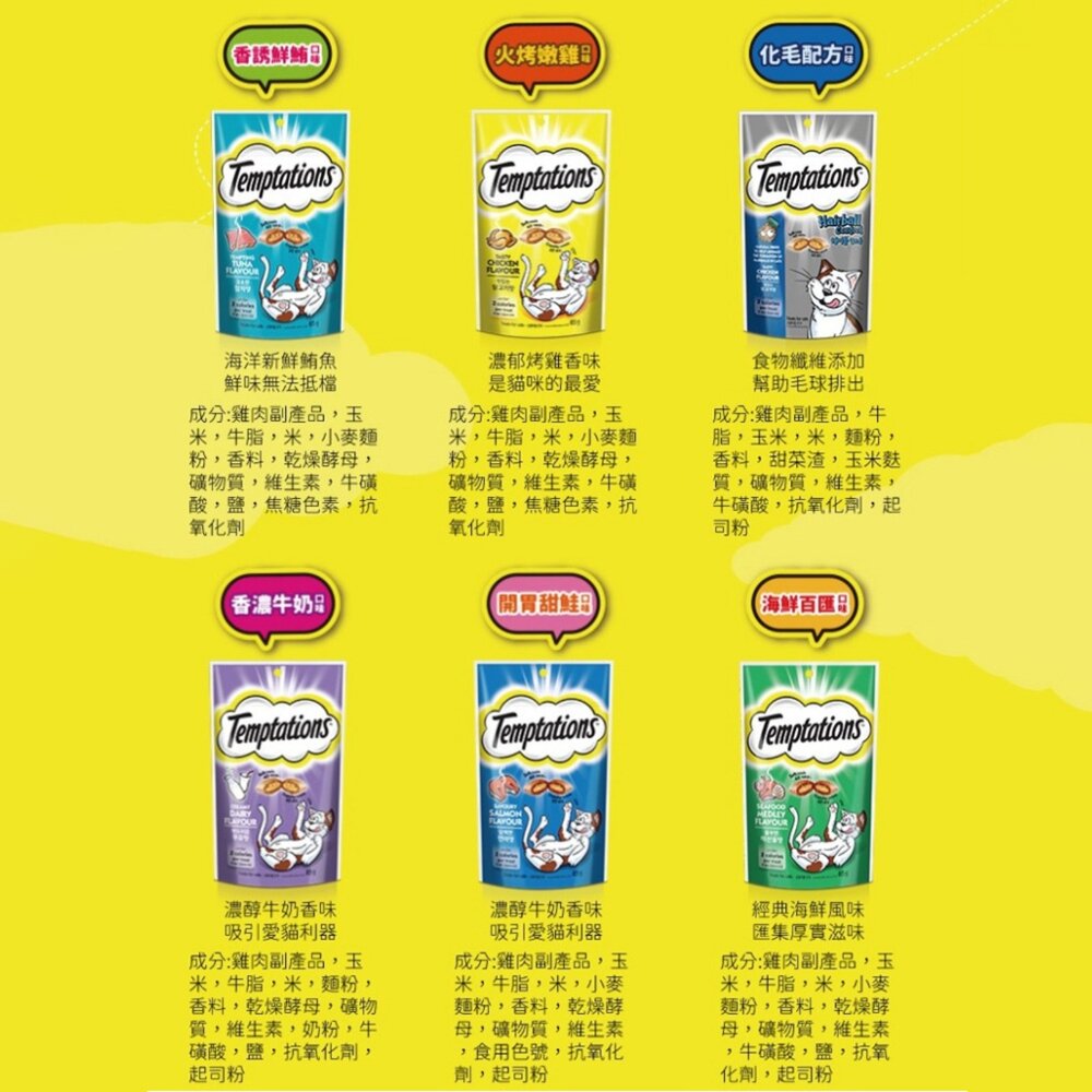 規格:香誘鮮鮪(淺藍)75g, 火烤嫩雞(黃)75g, 海鮮百匯(綠)75g, 開胃甜鮭(深藍)75g, 香濃牛奶(紫)75g, 化毛配方(灰)60g, 嘗鮮包-12G