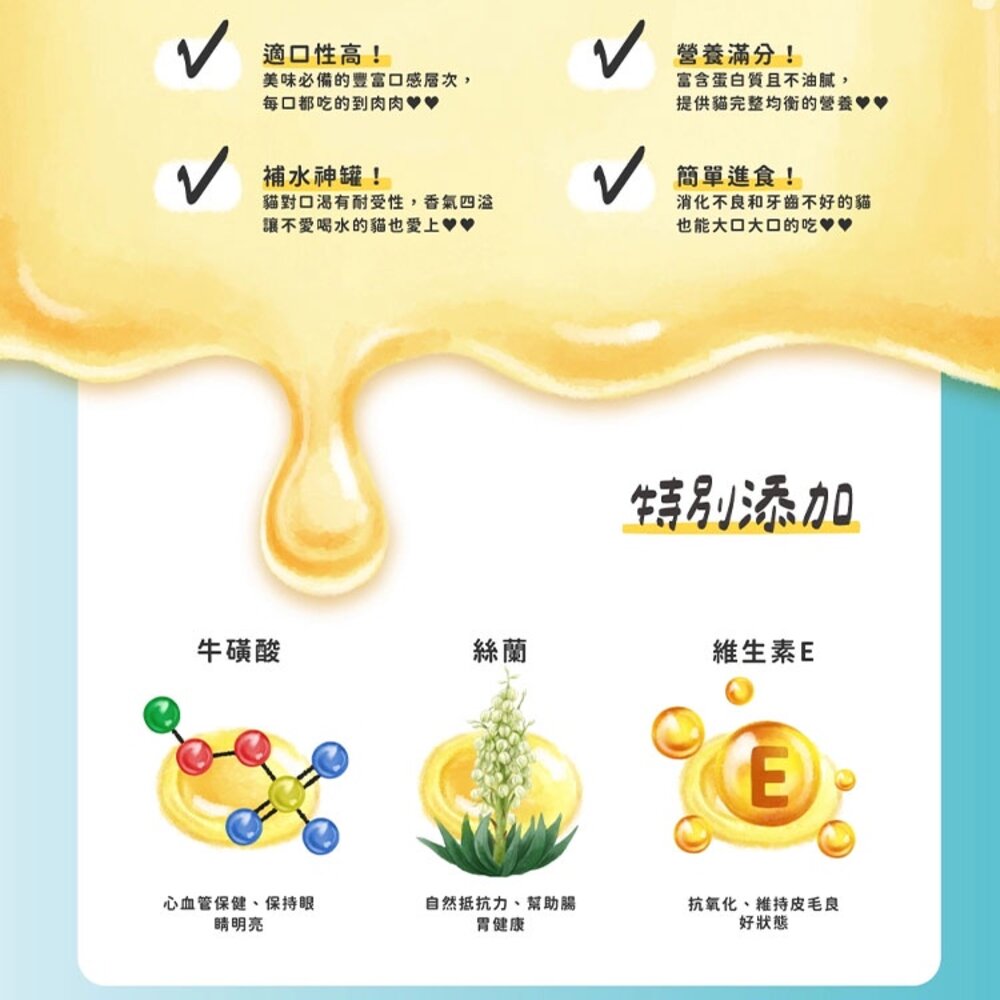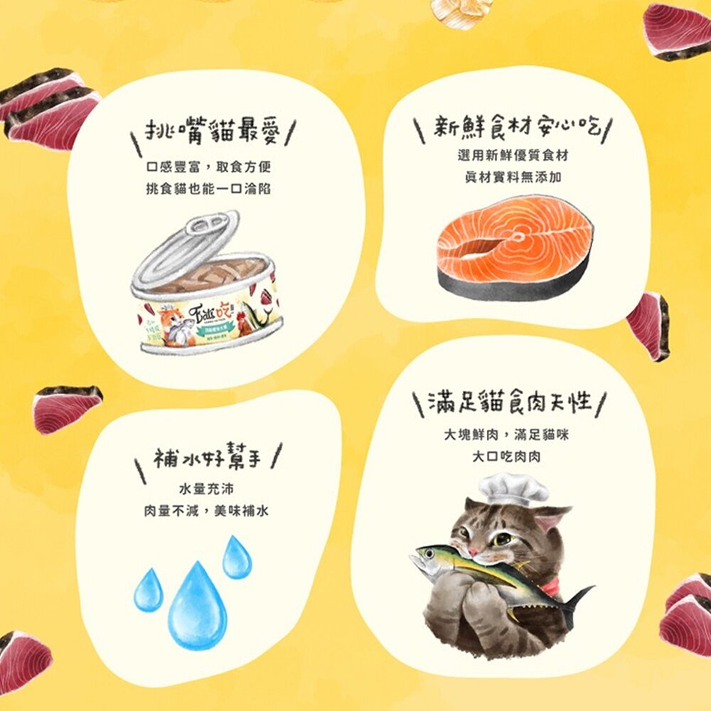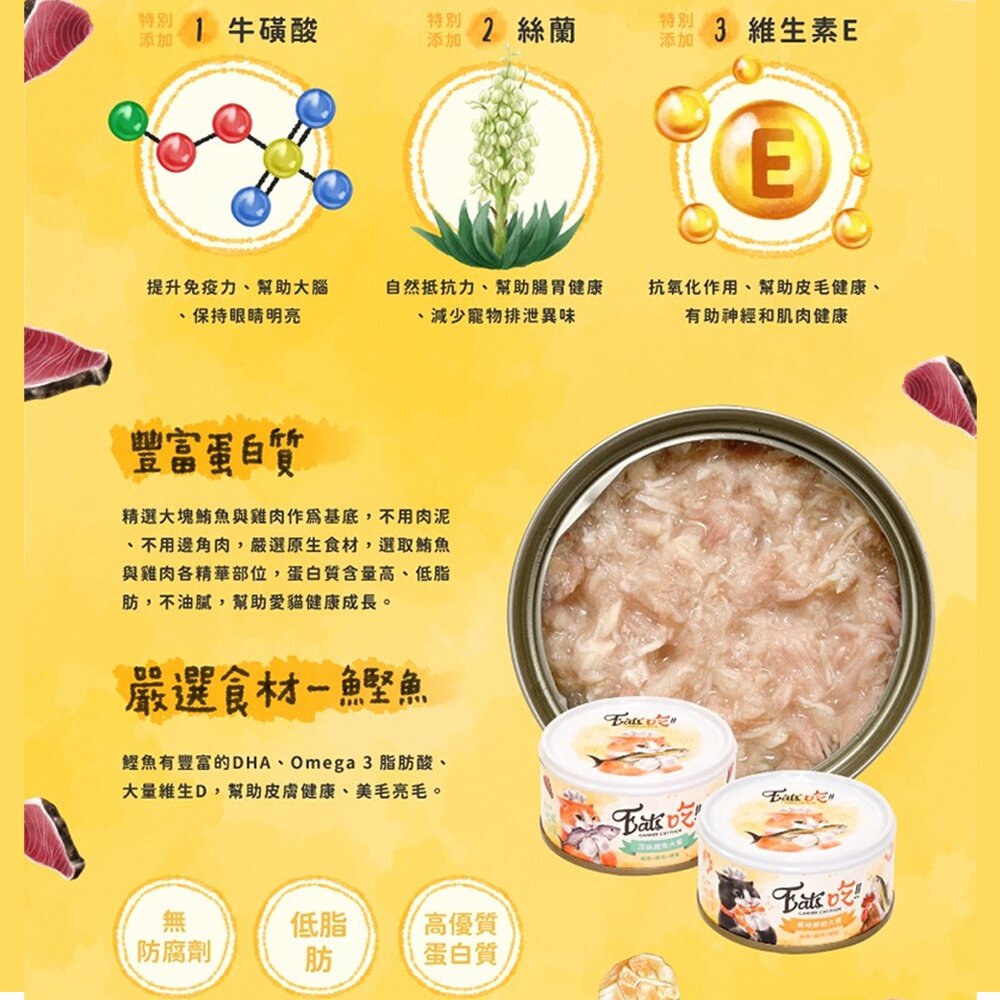 規格(超取限48):(副食80G)991 鮪魚雞肉干貝, (副食80G)992 鮪魚雞肉鮭魚, (副食80G)993 鮪魚雞肉吻仔魚, (副食80G)994 鮪魚雞肉鮮蝦, (副食80G)995 鮪魚雞肉鰹魚, (副食80G)996 鮪魚雞肉石榴, (喝口湯80G)445 鮪魚鮭魚, (喝口湯80G)446 鮪魚柴魚, (喝口湯80G)447 鮪魚扇貝, (喝口湯80G)448 鮪魚鮮蝦, (喝口湯80G)550 鮪魚燉雞, (喝口湯80G)551 嫩香雞