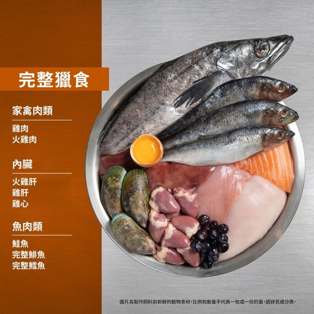 新鮮雞肉 (13%), 新鮮巢蛋 (7%), 新鮮火雞肉 (7%), 新鮮完整鯡魚 (7%), 新鮮雞肝 (6%), 新鮮完整比目魚 (4%), 新鮮火雞肝 (4%), 新鮮雞脖子 (4%), 新鮮雞心 (4%), 新鮮火雞心 (4%), 脫水雞肉 (4%), 脫水火雞肉 (4%), 脫水完整鯖魚 (4%), 脫水完整沙丁魚 (4%), 脫水完整鯡魚 (4%), 完整紅扁豆, 完整綠扁豆, 新鮮完整綠豌豆, 扁豆纖維, 新鮮完整鷹嘴豆, 新鮮完整黃豌豆, 完整花豆, 新鮮雞軟骨 (1%), 完整白腰豆, 鯡魚油 (1%), 雞脂肪 (1%), 新鮮火雞軟骨 (1%), 冷凍乾燥雞肝, 冷凍乾燥火雞肝,