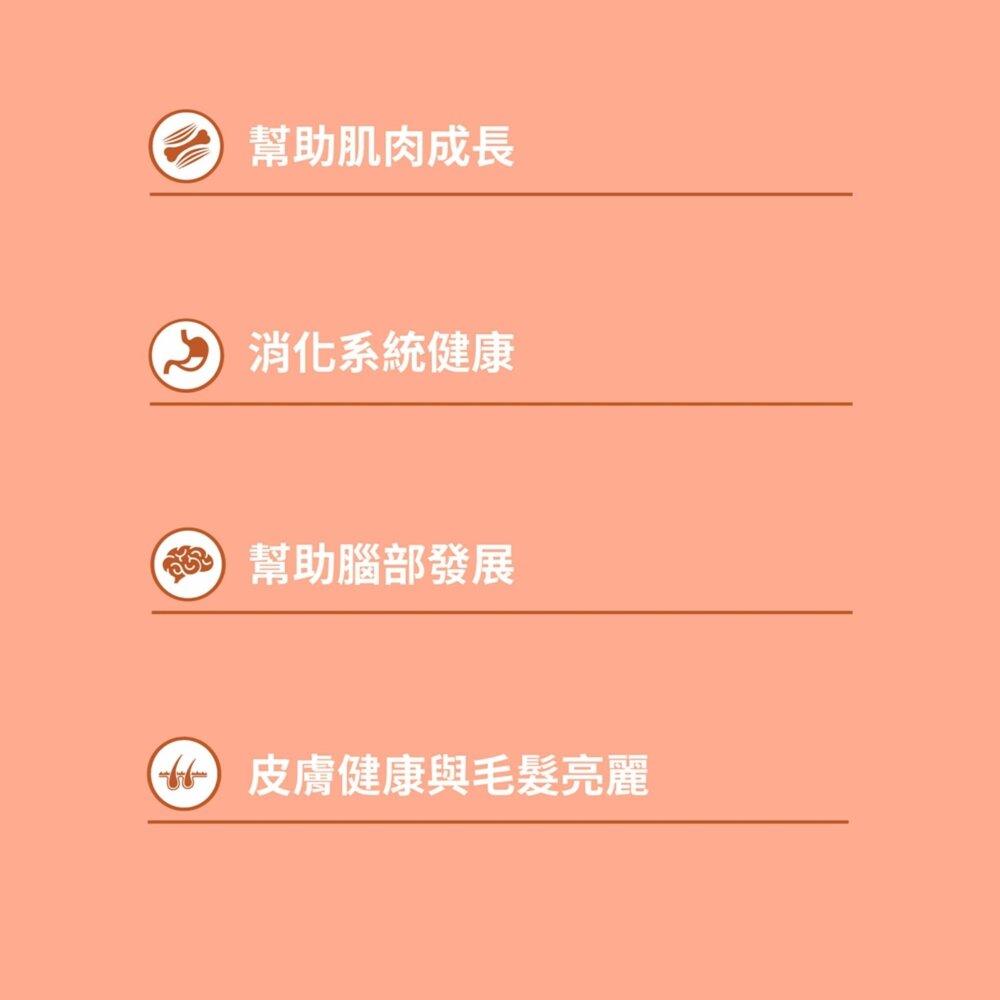 粗蛋白 (38%), 脂肪含量 (20%),粗灰分 (8%),粗纖維 (5%), 水分 (12%), 鈣 (1.4%),磷 (1.1%), Omega-3 (1.1%), Omega-6 (3%),DHA (0.35%), EPA (0.25%),葡萄糖胺 1500mg/kg硫酸軟骨素 1200mg/kg