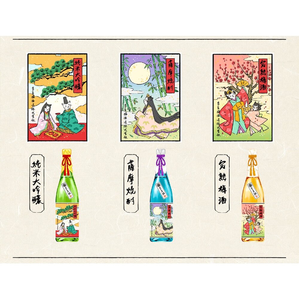 規格:家安全(紅), 幸福感(粉), 身體壯(綠), 好學習(藍), 福長壽(紫), 招財來(黃), 純米大吟釀玩具 (綠), 薩摩燒酎玩具 (藍), 完熟梅酒玩具 (橘)