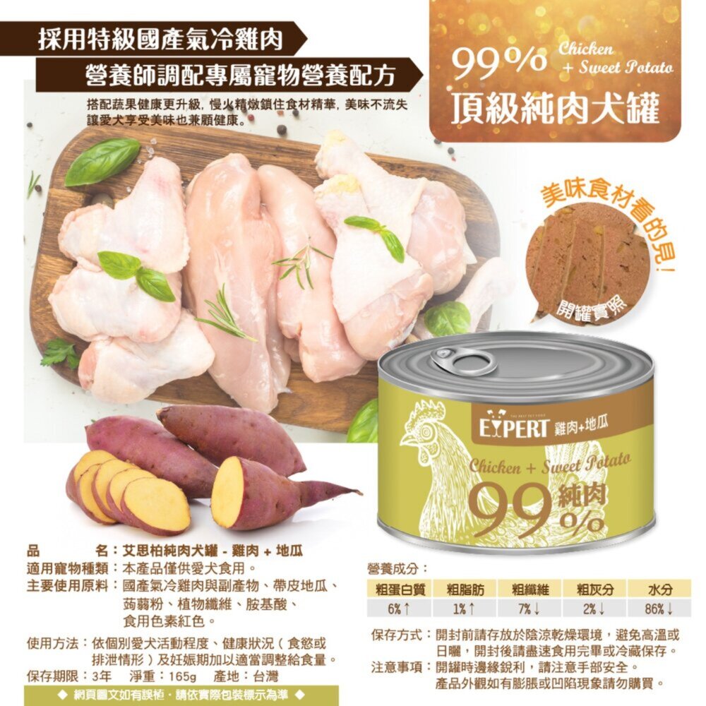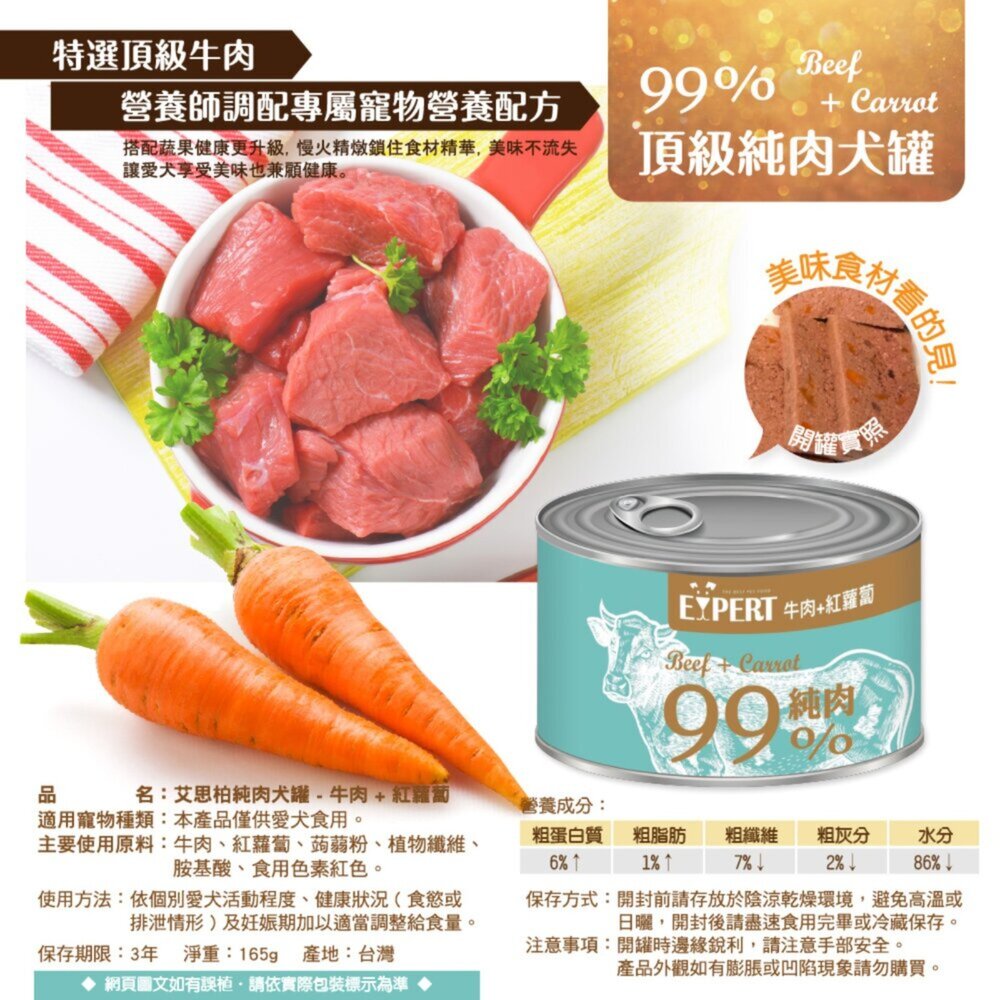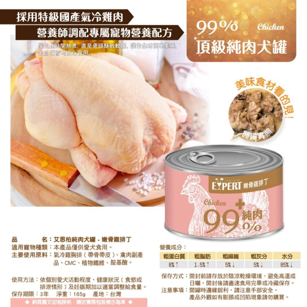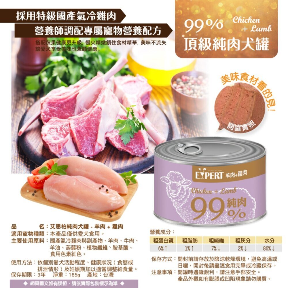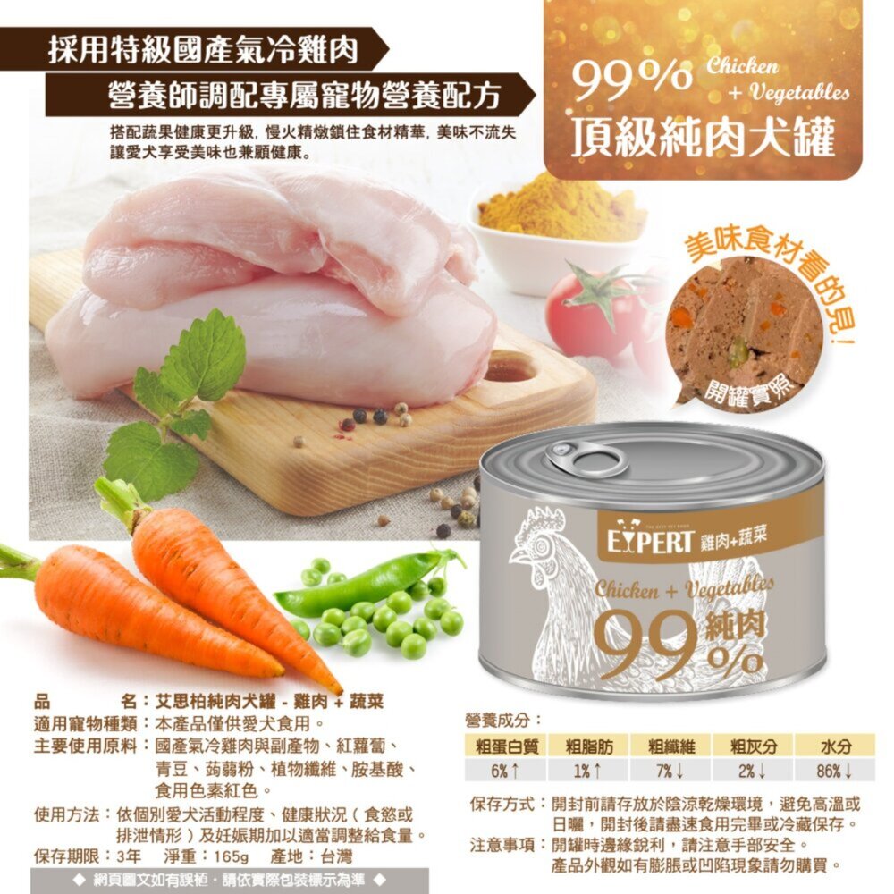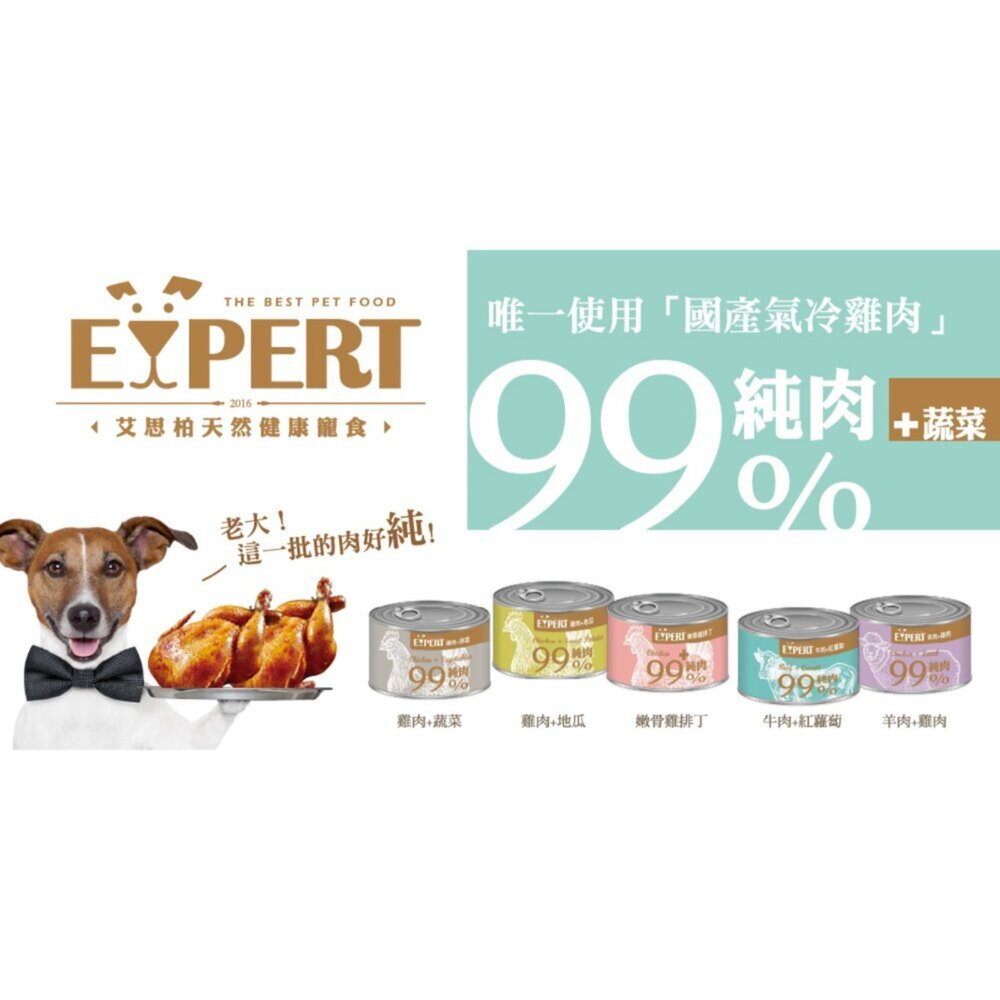 商品名稱:EXPERT 艾思柏 99%純肉犬罐 165G 雞肉 牛肉 蔬菜 純肉罐 狗罐頭毛掌櫃寵物店