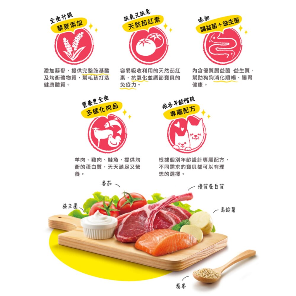 規格(超取限重5公斤):幼犬羊肉1.5kg, 成犬雞肉1.5kg, 成犬羊肉小顆1.5kg, 高齡犬羊肉1.5kg, 成幼犬鮭魚1.5kg, 幼犬羊肉3kg, 成犬雞肉3kg, 成犬羊肉小顆3kg, 成犬羊肉大顆3kg, 高齡犬羊肉3kg, 成幼犬鮭魚3kg, 幼犬羊肉7kg(限宅配), 成犬雞肉7kg(限宅配), 成犬羊肉小顆7kg(限宅配), 成犬羊肉大顆7kg(限宅配), 高齡犬羊肉7kg(限宅配), 成幼犬鮭魚7kg(限宅配), 幼犬羊肉13.6kg(限宅配), 成犬雞肉13.6kg(限宅配), 成犬羊小顆13.6kg(限宅配), 成犬羊大顆13.6kg(限宅配), 高齡犬羊肉13.6kg(限宅配), 零穀2.5磅 全犬羊肉鮭魚, 零穀2.5磅 全犬五種魚, 零穀2.5磅 成犬雞肉體控, 零穀5.5磅 全犬羊肉鮭魚, 零穀5.5磅 全犬五種魚, 零穀5.5磅 成犬雞肉體控, 零穀15磅 全犬羊肉鮭魚(限宅配), 零穀15磅 全犬五種魚(限宅配), 零穀15磅 成犬雞肉體控(限宅配)