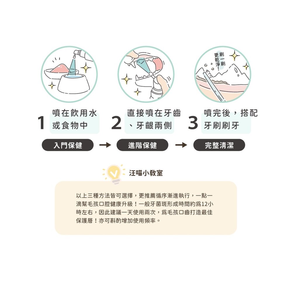✔噴灑在食物、飲水中 ✔直接噴於犬貓牙齦兩側 ✔搭配牙刷使用