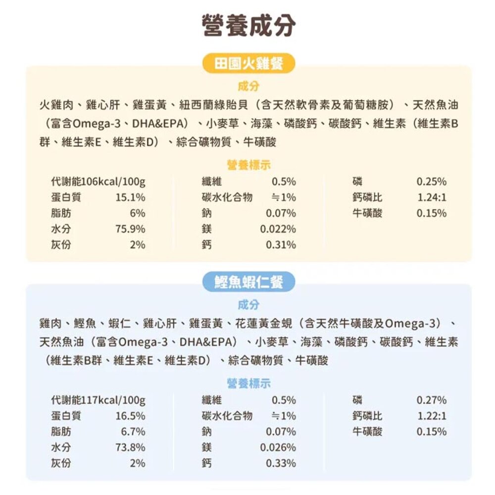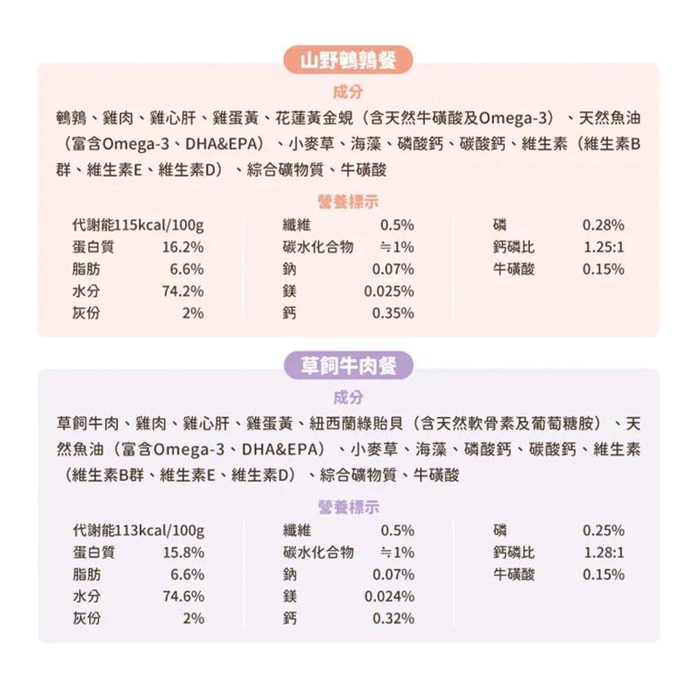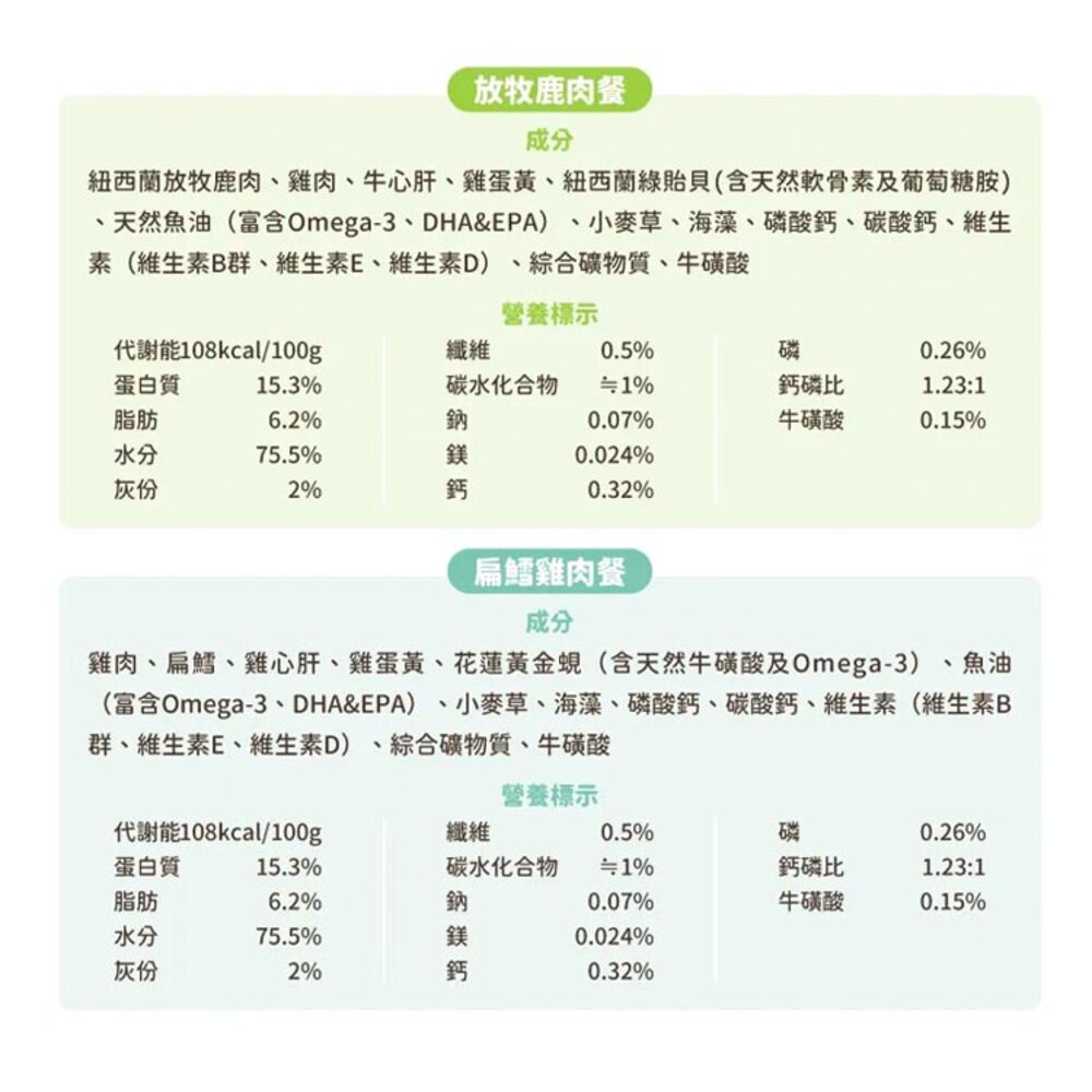 規格(超取限重5公斤):(98%鮮肉80G)低敏鴨肉, (98%鮮肉80G)田園火雞, (98%鮮肉80G)鰹魚蝦仁, (98%鮮肉80G)扁鱈雞肉, (98%鮮肉80G)放牧鹿, (98%鮮肉80G)草飼牛肉, (98%鮮肉165G)低敏鴨肉, (98%鮮肉165G)田園火雞, (98%鮮肉165G)鰹魚蝦仁, (98%鮮肉165G)扁鱈雞肉, (98%鮮肉165G)山野鵪鶉, (98%鮮肉165G)放牧鹿, (98%鮮肉165G)草飼牛肉