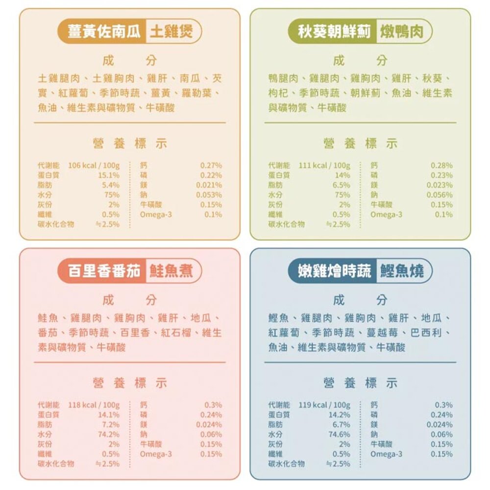 雞肉、地瓜、雞胗、薏仁、鵪鶉蛋、紅蘿蔔、毛豆仁、亞麻籽粉、葵花籽油、乾海帶芽、熬煮高湯
