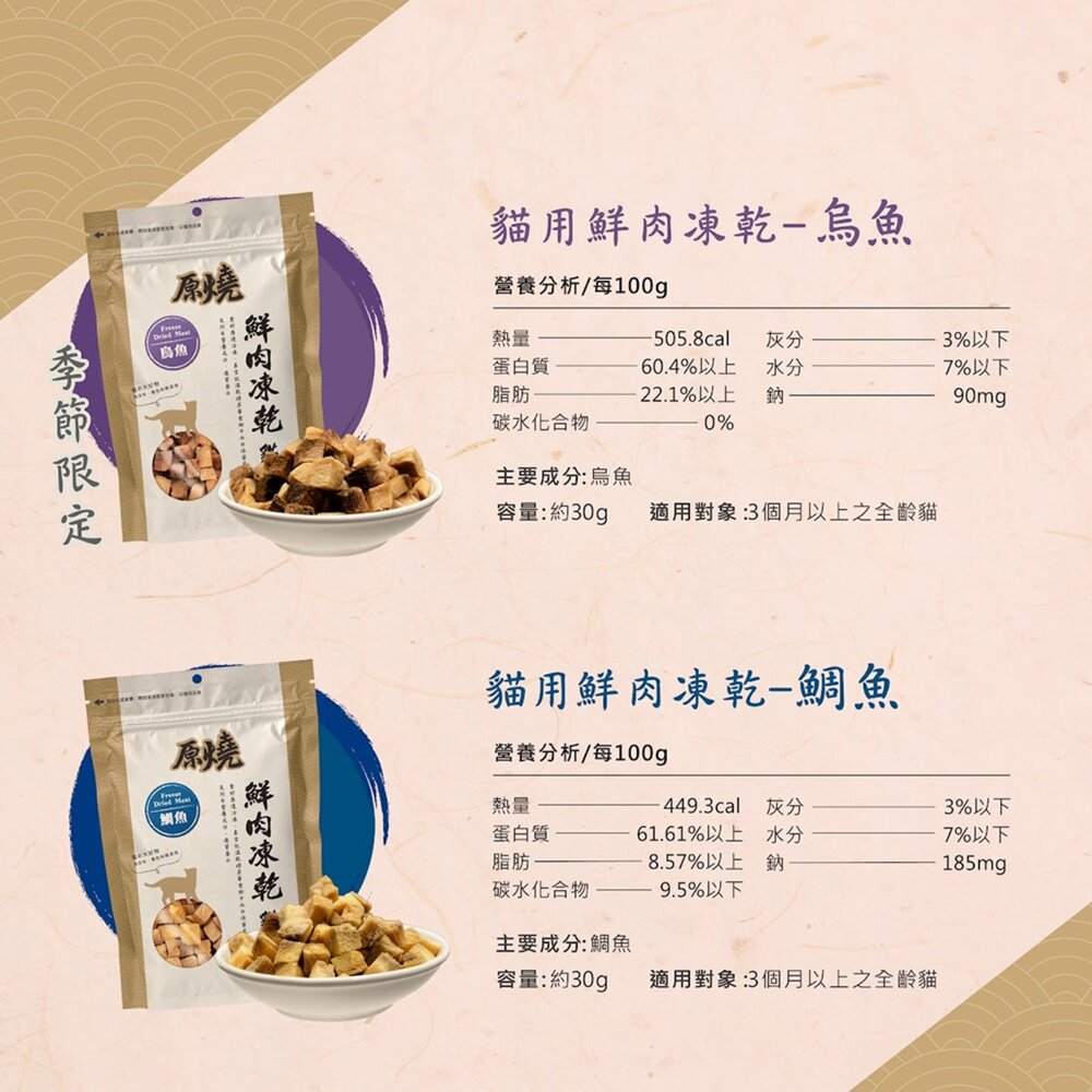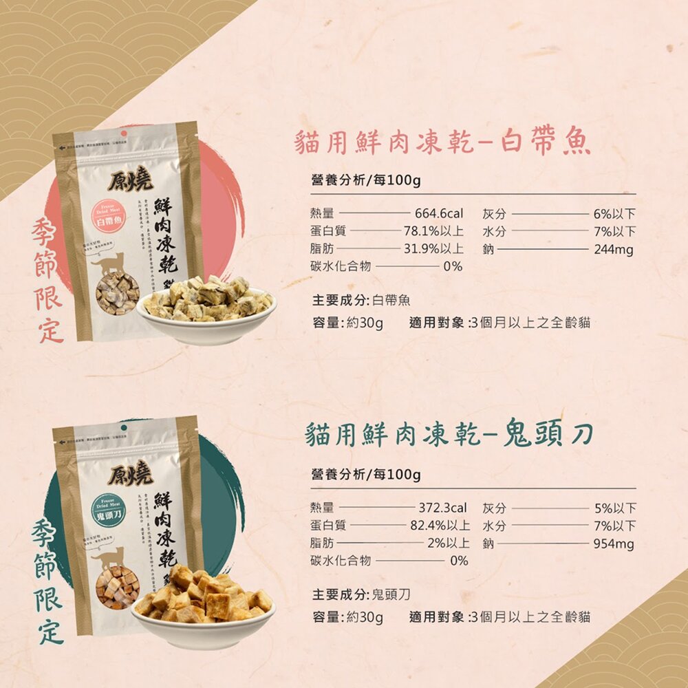 規格(超取限5公斤內):原燒凍乾-雞肉 30g, 原燒凍乾-火雞肉 30g, 原燒凍乾-鴨肉 30g, 原燒凍乾-牛肉 30g, 原燒凍乾-鮪魚 30g, 原燒凍乾-鯖魚 30g, 原燒凍乾-白帶魚 30g, 原燒凍乾-鬼頭刀 30g, 原燒凍乾-烏魚 30g, 原燒凍乾-鯛魚 30g