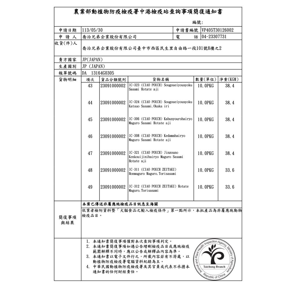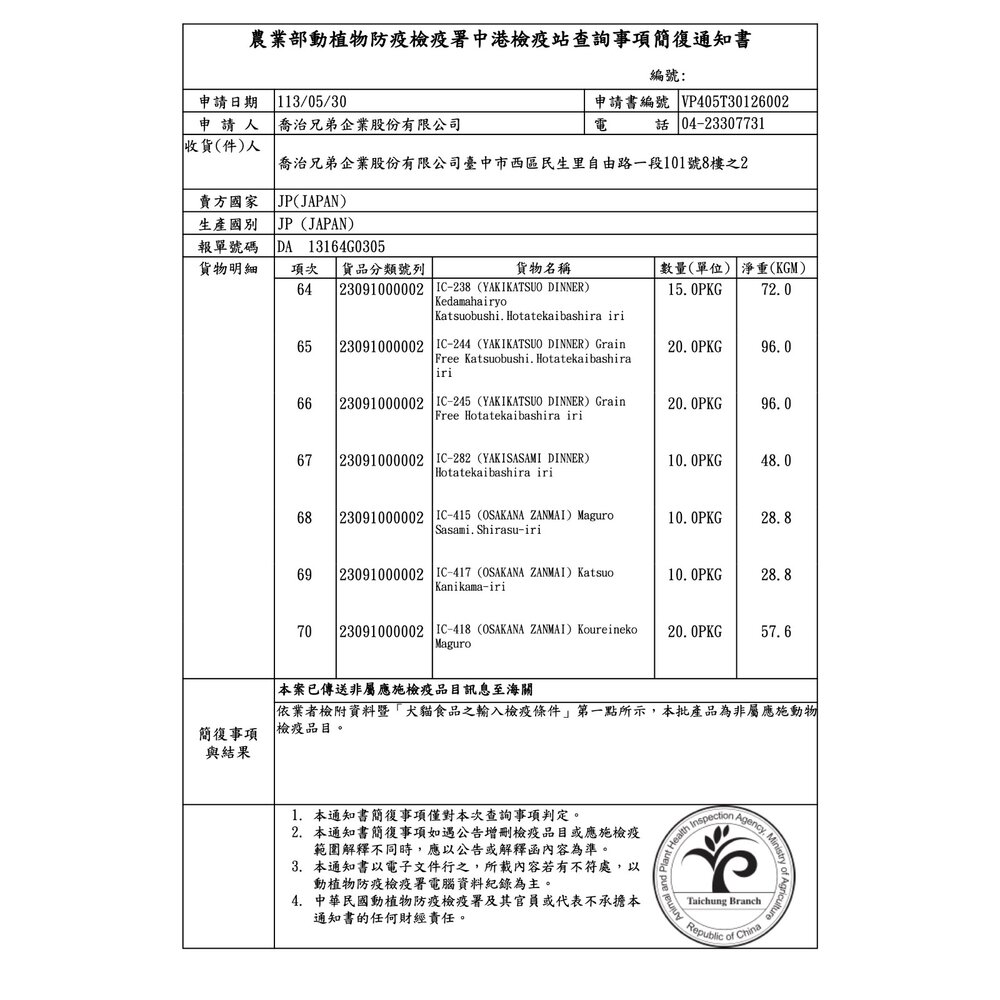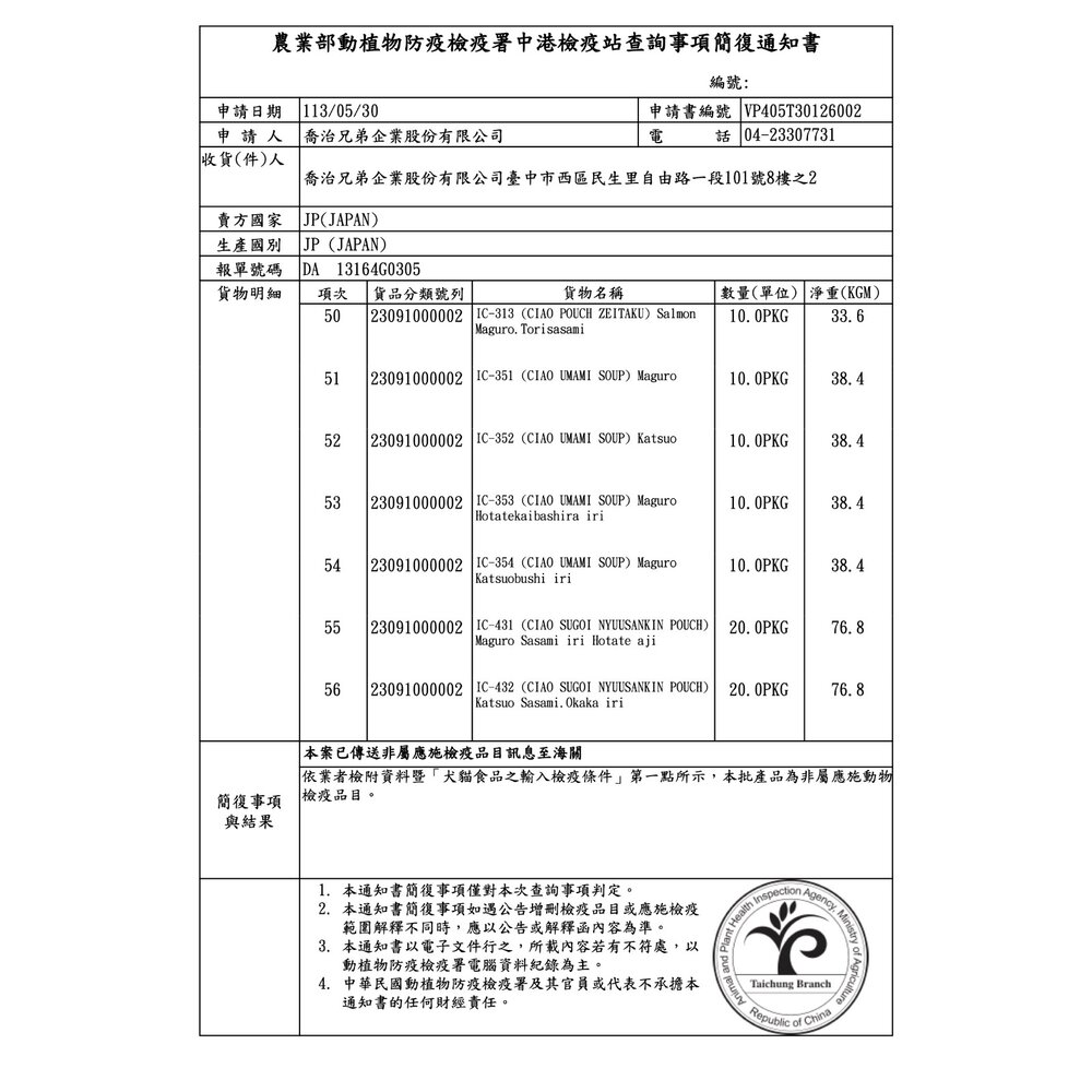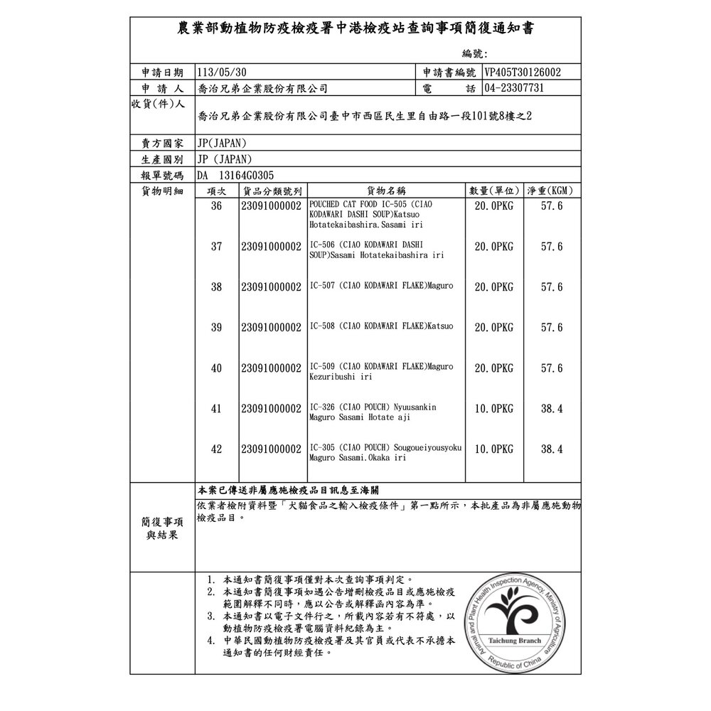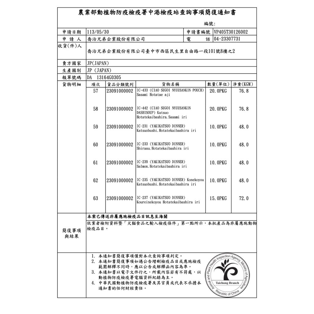 規格(超取限重5公斤):IC-231燒 鰹魚柴魚干貝50g, IC-232燒 鰹魚干貝50g, IC-233燒 鰹魚吻仔魚干貝50g, IC-234燒 高齡貓鰹柴干貝50g, IC-235燒 幼貓鰹魚柴魚干貝50g, IC-236燒 鰹干貝鰹魚湯50g, IC-237燒 高齡貓鰹魚干貝50g, IC-238燒 化毛鰹魚柴魚干貝50g, IC-239燒 鰹魚鮭魚干貝50g, IC-244燒 無穀鰹魚柴魚干貝50g, IC-281燒 雞肉蟹肉干貝50g, IC-282燒 雞肉干貝50g, IC-305巧 綜合營養鮪雞柴40g, IC-306巧 泌尿鮪雞干貝40g, IC-311巧 奢華鮪魚雞肉35g, IC-312巧 干貝鮪魚雞肉35g, IC-313巧 奢華鮭魚鮪雞35g, IC-324巧 成貓鰹雞柴40g, IC-351鰹 鮪魚鰹魚40g, IC-352鰹 鰹魚40g, IC-353鰹 鮪魚鰹魚干貝40g, IC-354鰹 鰹魚柴魚40g, IC-431巧乳酸菌 鮪雞干貝40g, IC-432巧乳酸菌 鮪雞柴40g, IC-433巧乳酸菌 雞干貝40g, IC-441巧乳酸菌 鮪干貝雞40g, IC-442巧乳酸菌 鰹干貝雞40g