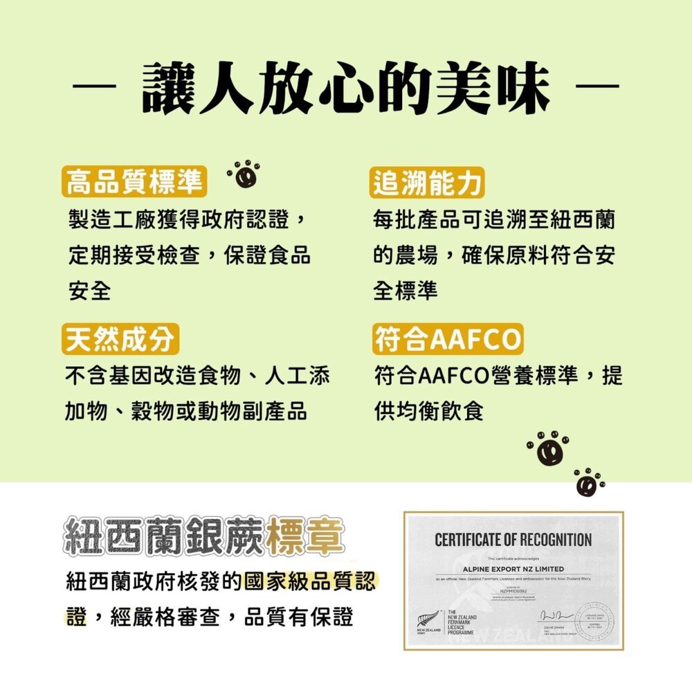 羊肉、羊肺、羊肝、鹿肉、亞麻籽、綠唇貽貝、卵磷脂、椰子甘油、羊骨、磷酸二鉀、鹽、碳酸鈣、氯化膽鹼、牛磺酸、天然抗氧化劑、鐵、鋅、維生素E、硒、銅、維生素B1、維生素B5、葉酸、鉀、鈣。