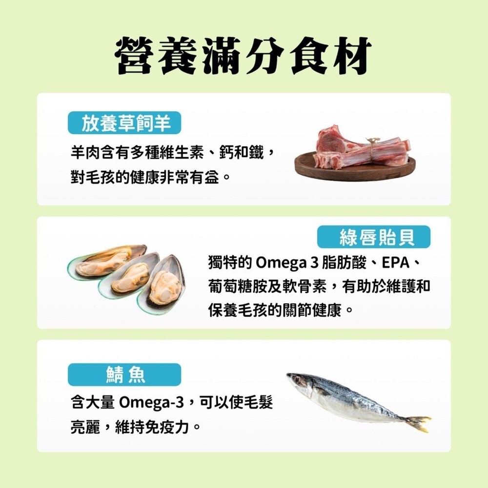 羊肉、羊肺、羊肝、鯖魚、亞麻籽、卵磷脂、椰子甘油、綠唇貽貝、羊骨、磷酸二鉀、鹽、碳酸鈣、氯化膽鹼、牛磺酸、天然抗氧化劑、鐵、鋅、維生素E、硒、銅、維生素B2、維生素B12、葉酸。