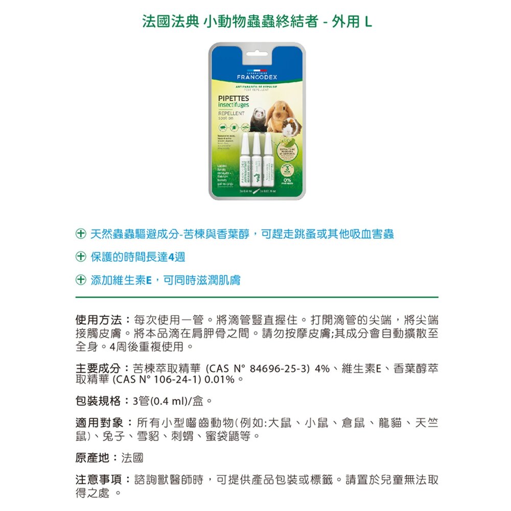 用途:本品由天然蟲蟲驅避成分-苦楝與香葉醇所製成,可有效趕走跳蚤或其他吸血害蟲,讓小動物受到4週的保護。本品含維生素E,可同時滋潤肌膚,強化毛囊。