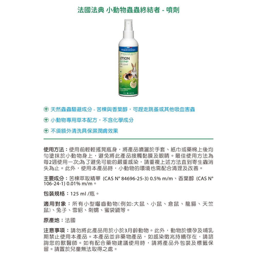 用法:使用前輕輕搖晃瓶身,將產品噴 灑於手套、紙巾或藥棉上後均勻塗抹於小動物身上,避免將此產品接觸黏膜及 眼睛。最佳使用方法為每2週使用一次;為了避免可能的嚴重感染,請重複上述方法直到寄生蟲消失為止。此外,使用本產品時,小動物的環境也需配合清理及改善。