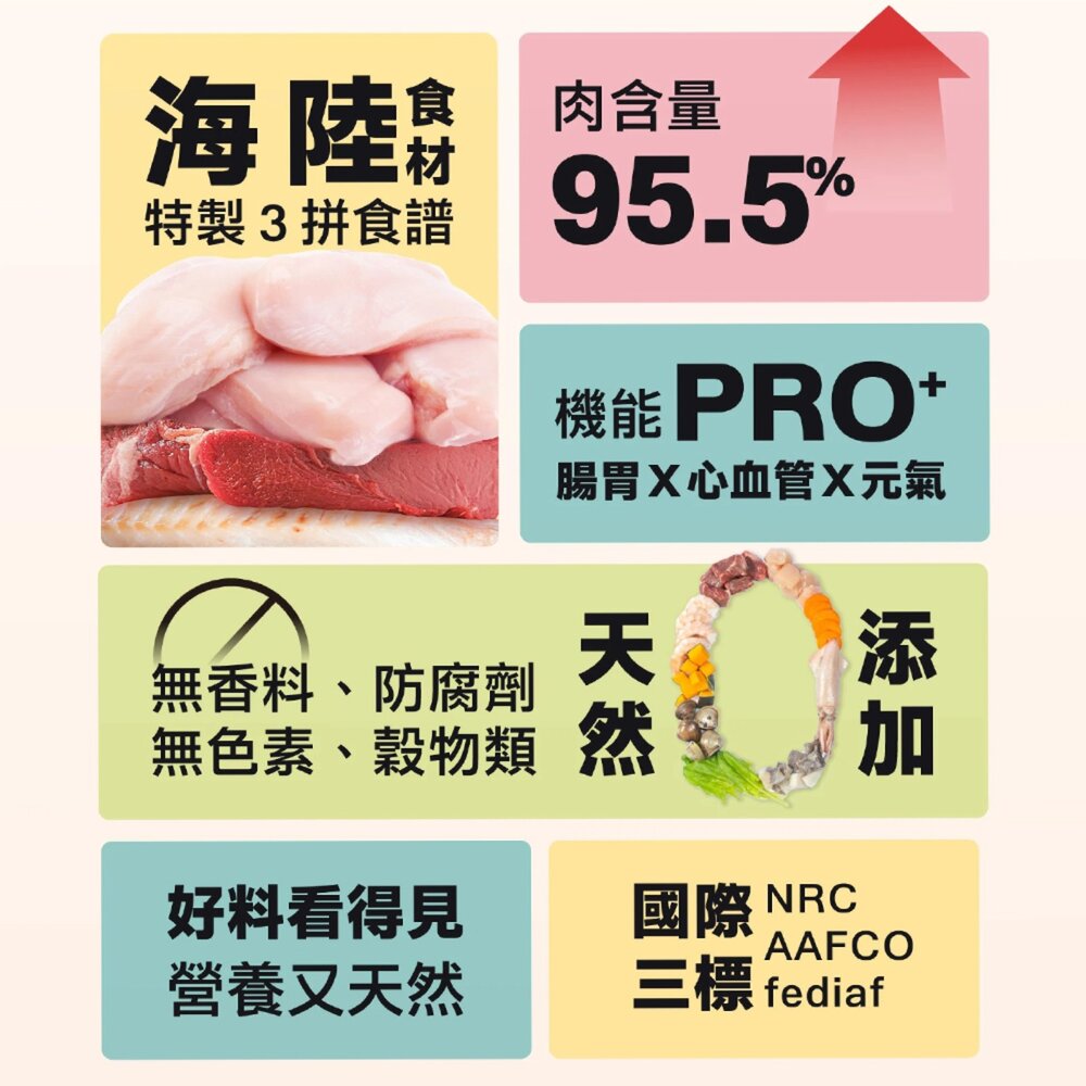 雞肉蝦仁 雞胸肉、雞腿肉、雞胗、雞心、蝦仁、雞肝、菠菜、碳酸鈣、魚油、綜合維生素、專利益生元膳食纖維、牛磺酸、綜合礦物質 代謝能416kcal/100g