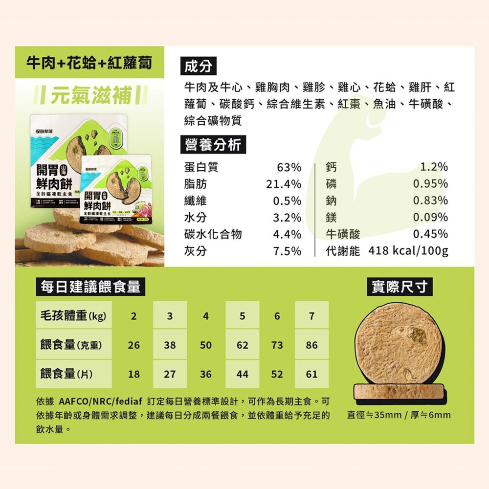 牛肉花蛤 牛肉及牛心、雞胸肉、雞胗、雞心、花蛤、雞肝、紅蘿蔔、碳酸鈣、綜合維生素、紅棗、魚油、牛磺酸、綜合礦物質 代謝能418kcal/100g、