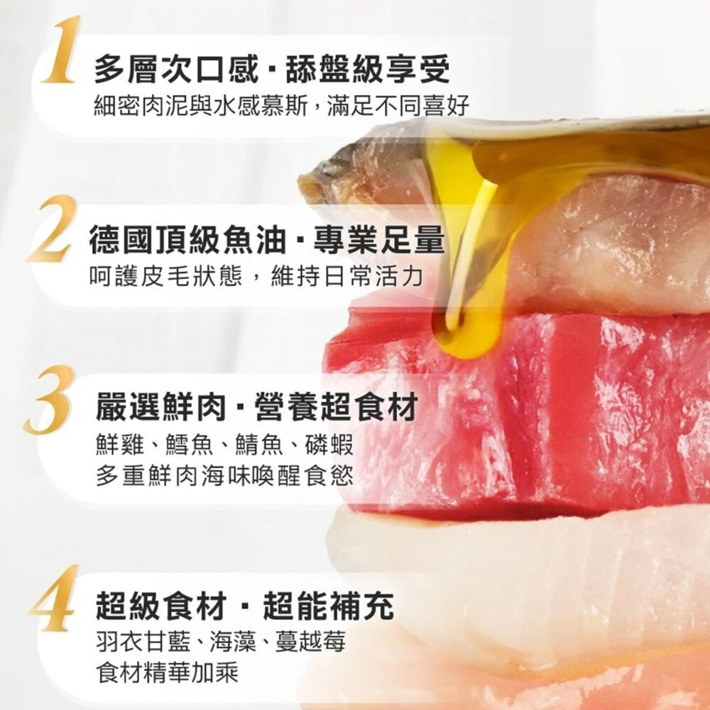 規格(超取限5公斤內):鮮雞鱈魚(水感慕斯)82g, 磷蝦鰹魚(水感慕斯)82g, 鮮雞鯖魚(細密肉泥)82g, 鮮雞肉(細密肉泥)82g
