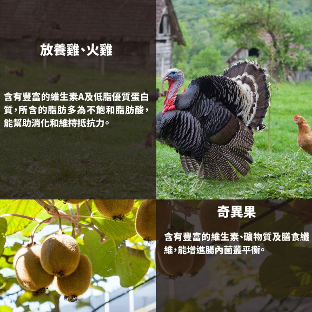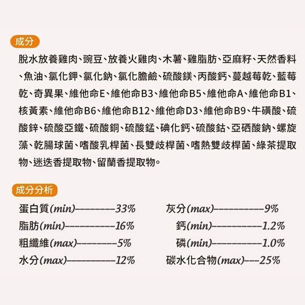 脫水放養雞肉、豌豆、放養火雞肉、木薯、雞脂肪、亞麻籽、天然香料、魚油、氯化鉀、氯化鈉、氯化膽鹼、硫酸鎂、丙酸鈣、蔓越莓乾、藍莓乾、奇異果、維他命E、維他命B3、維他命B5、維他命A、維他命B1、核黃素、維他命B6、維他命B12、維他命D3、維他命B9、牛磺酸、硫酸鋅、硫酸亞鐵、硫酸銅、硫酸錳、碘化鈣、硫酸鈷、亞硒酸鈉、螺旋藻、乾腸球菌、嗜酸乳桿菌、長雙歧桿菌、嗜熱雙歧桿菌、綠茶提取物、迷迭香提取物、留蘭香提取物。