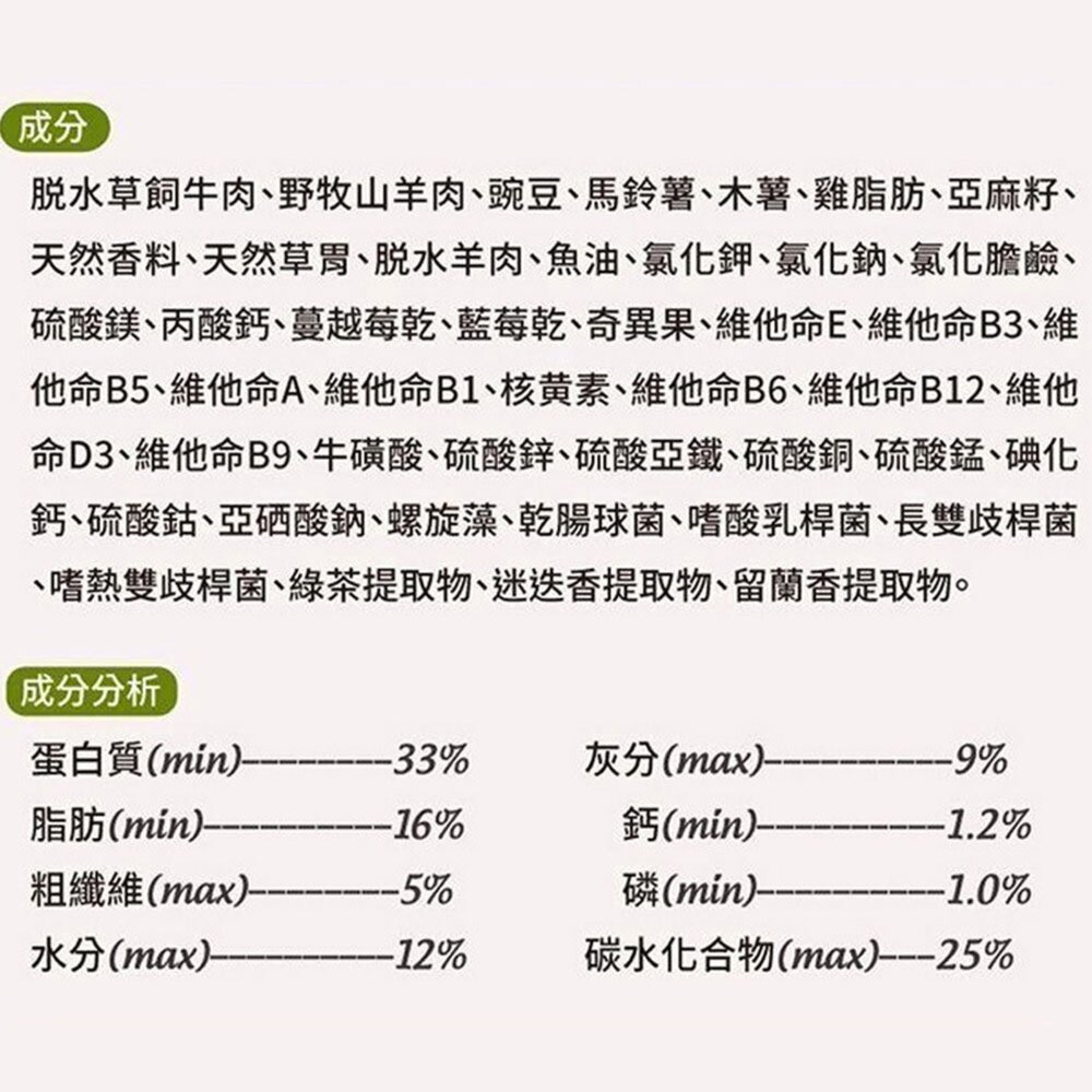 脱水草飼牛肉、野牧山羊肉、豌豆、馬鈴薯、木薯、雞脂肪、亞麻籽、天然香料、天然草胃、脱水羊肉、魚油、氯化鉀、氯化鈉、氯化膽鹼、硫酸鎂、丙酸鈣、蔓越莓乾、藍莓乾、奇異果、維他命E、維他命B3、維他命B5、維他命A、維他命B1、核黃素、維他命B6、維他命B12、維他命D3、維他命B9、牛磺酸、硫酸鋅、硫酸亞鐵、硫酸銅、硫酸錳、碘化鈣、硫酸鈷、亞硒酸鈉、螺旋藻、乾腸球菌、嗜酸乳桿菌、長雙歧桿菌、嗜熱雙歧桿菌、綠茶提取物、迷迭香提取物、留蘭香提取物。