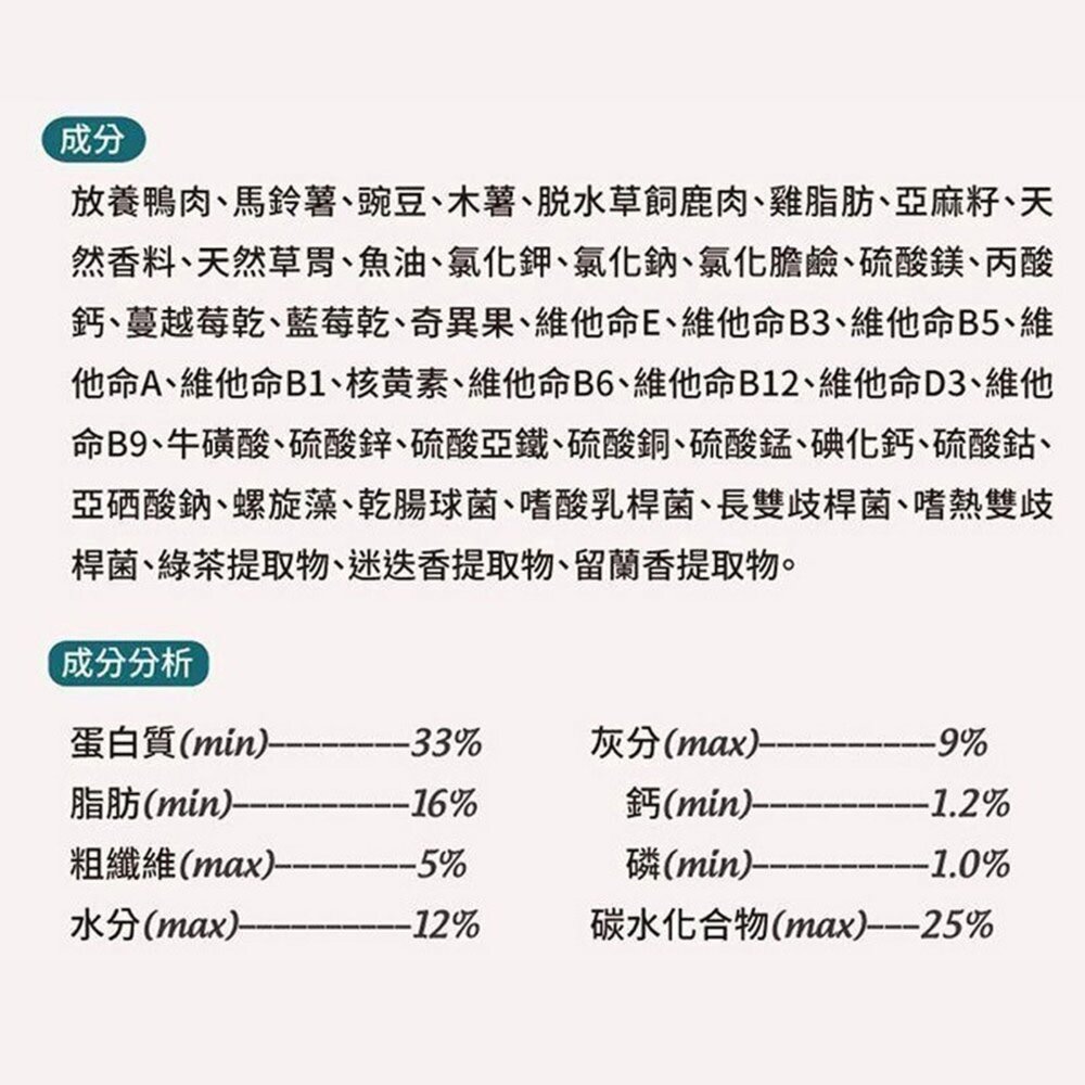 放養鴨肉、馬鈴薯、豌豆、木薯、脱水草飼鹿肉、雞脂肪、亞麻籽、天然香料、天然草胃、魚油、氯化鉀、氯化鈉、氯化膽鹼、硫酸鎂、丙酸鈣、蔓越莓乾、藍莓乾、奇異果、維他命E、維他命B3、維他命B5、維他命A、維他命B1、核黃素、維他命B6、維他命B12、維他命D3、維他命B9、牛磺酸、硫酸鋅、硫酸亞鐵、硫酸銅、硫酸錳、碘化鈣、硫酸鈷、亞硒酸鈉、螺旋藻、乾腸球菌、嗜酸乳桿菌、長雙歧桿菌、嗜熱雙歧桿菌、綠茶提取物、迷迭香提取物、留蘭香提取物。