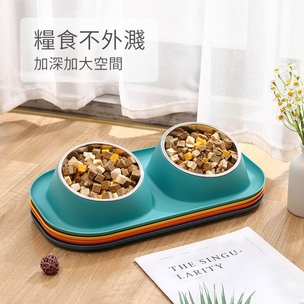 這款雙碗寵物餐盤組,結合不鏽鋼碗與繽紛底座設計,