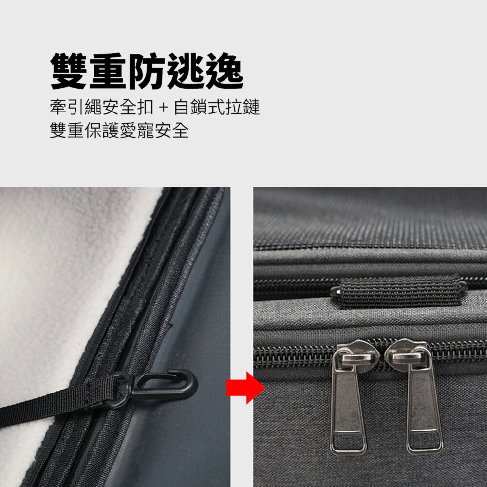 - 雙重防逃逸機制:牽引繩安全扣+自鎖式拉鍊,保障安全