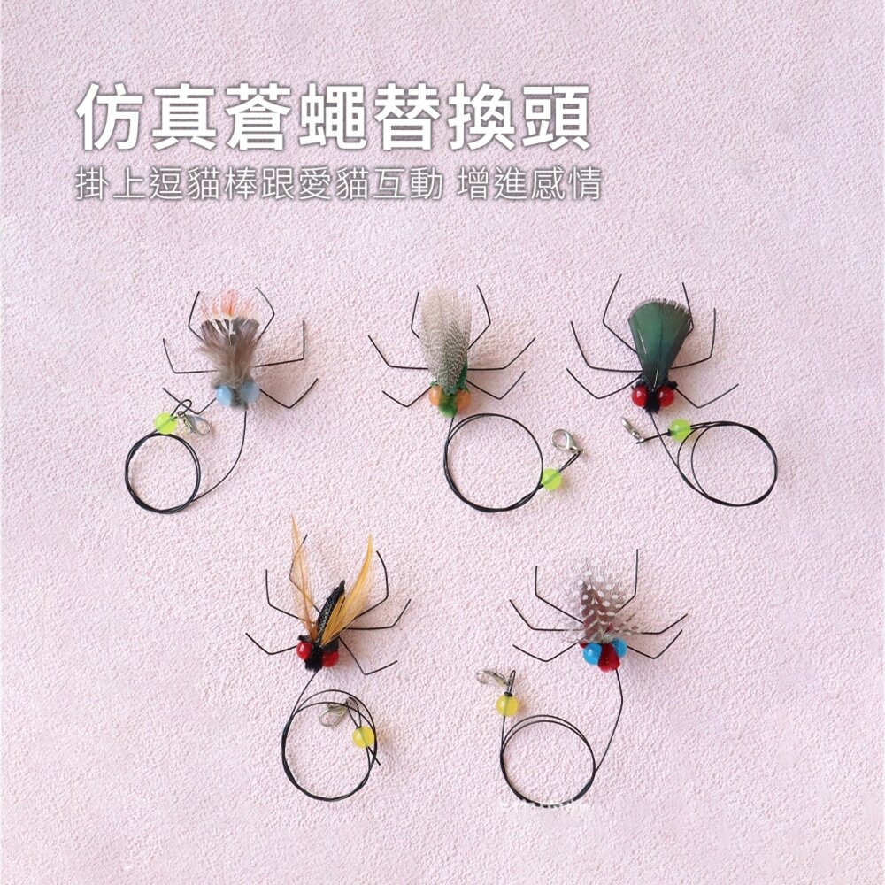 這款逗貓棒替換頭以仿真蒼蠅造型設計,搭配靈活長繩與高韌性羽毛,
