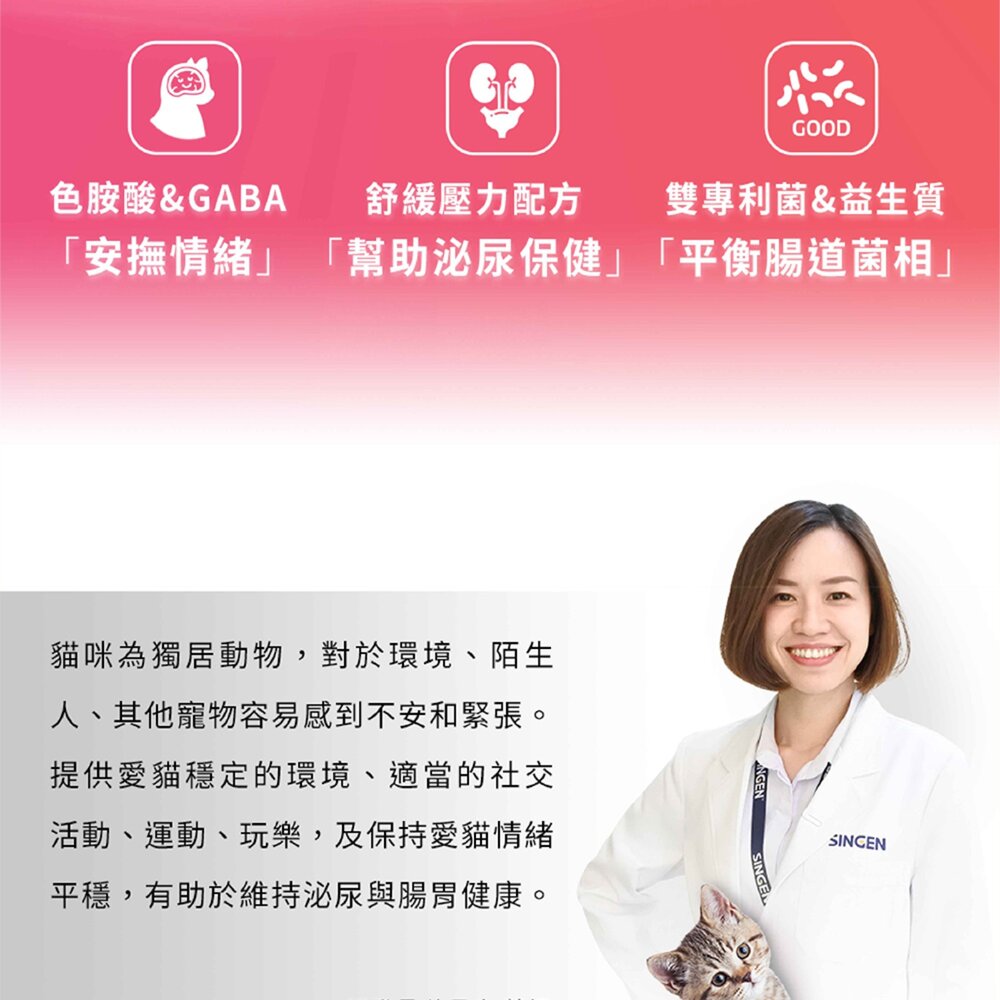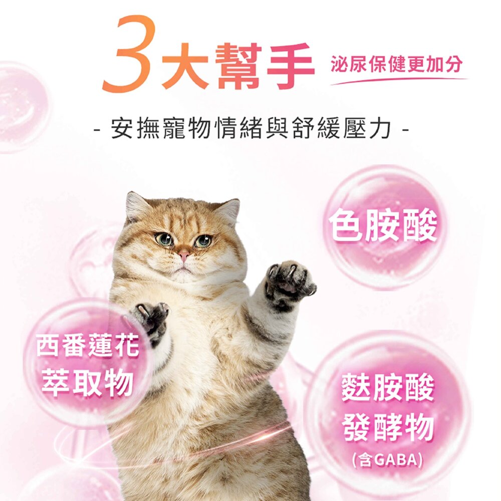 乙醯葡萄糖胺及色胺酸、GABA等,有助於安撫愛貓情緒與泌尿保健。