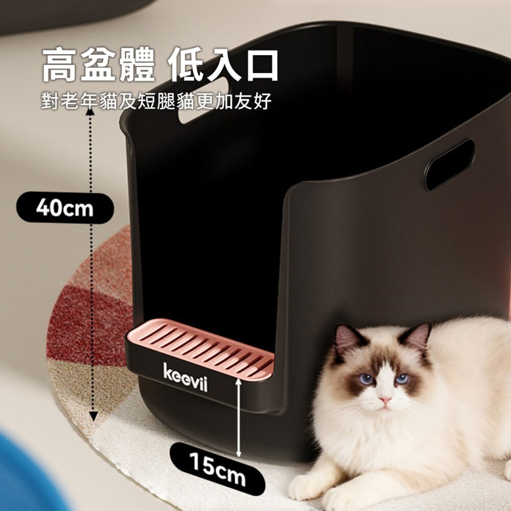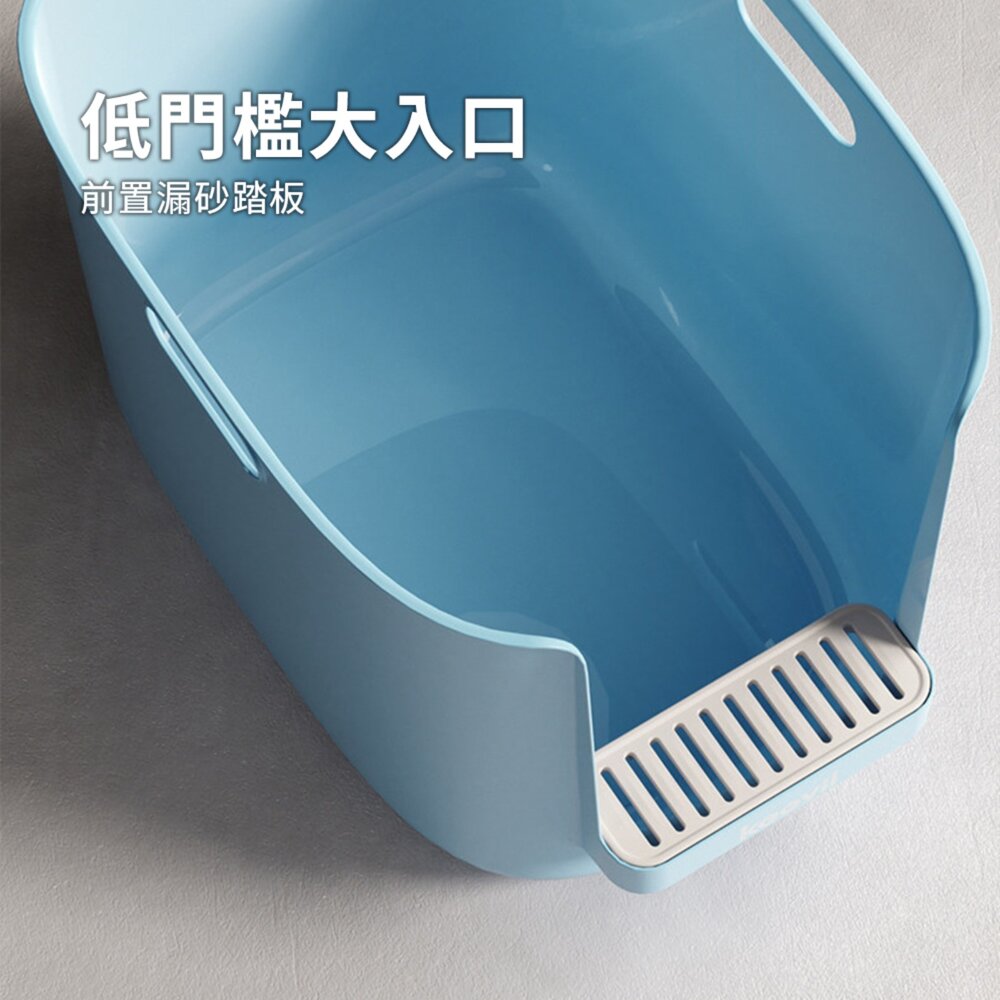 又方便老年貓、短腿貓輕鬆進出。內壁光滑無死角,清洗更簡單,搭配前置漏砂踏板,