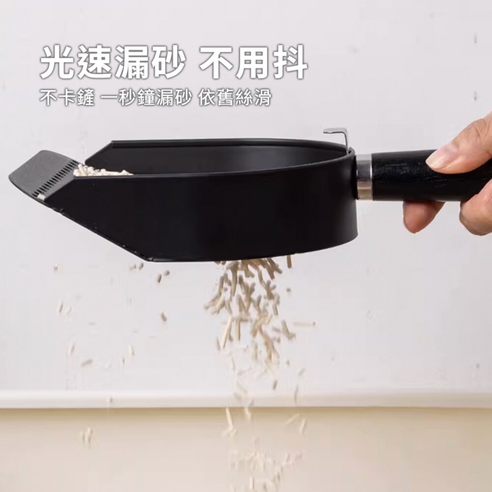 這款 全黑不鏽鋼貓砂鏟 專為豆腐砂、礦砂等多種貓砂設計,