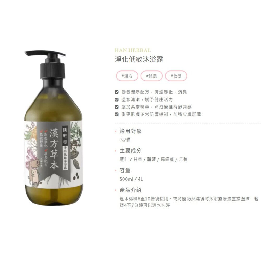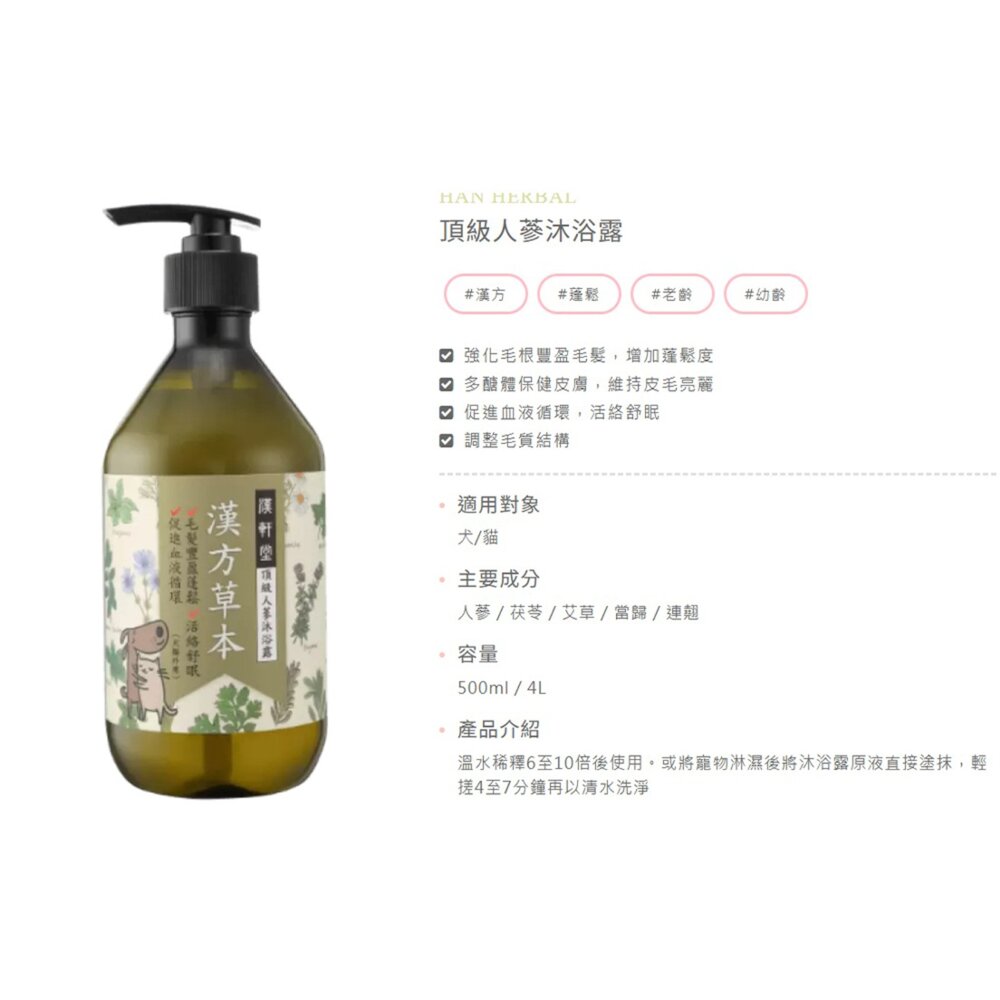 商品名稱:漢軒堂沐浴乳 犬貓用沐浴乳 貓狗用沐浴乳 低敏淨化 頂級人參 皮膚健康 防蟲消臭 寵物用品 寵身用 沐浴乳 寵物美容毛掌