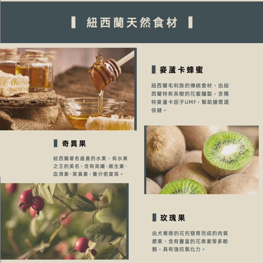 ● 含麥盧卡蜂蜜、奇異果、玫瑰果等紐西蘭特色食材