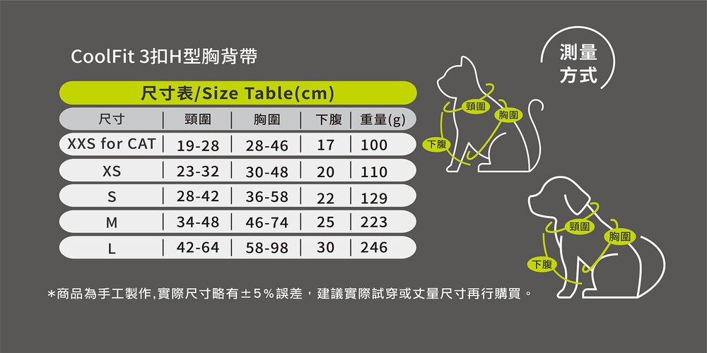 CoolFit 3扣H型胸背帶「尺寸表(公分)」