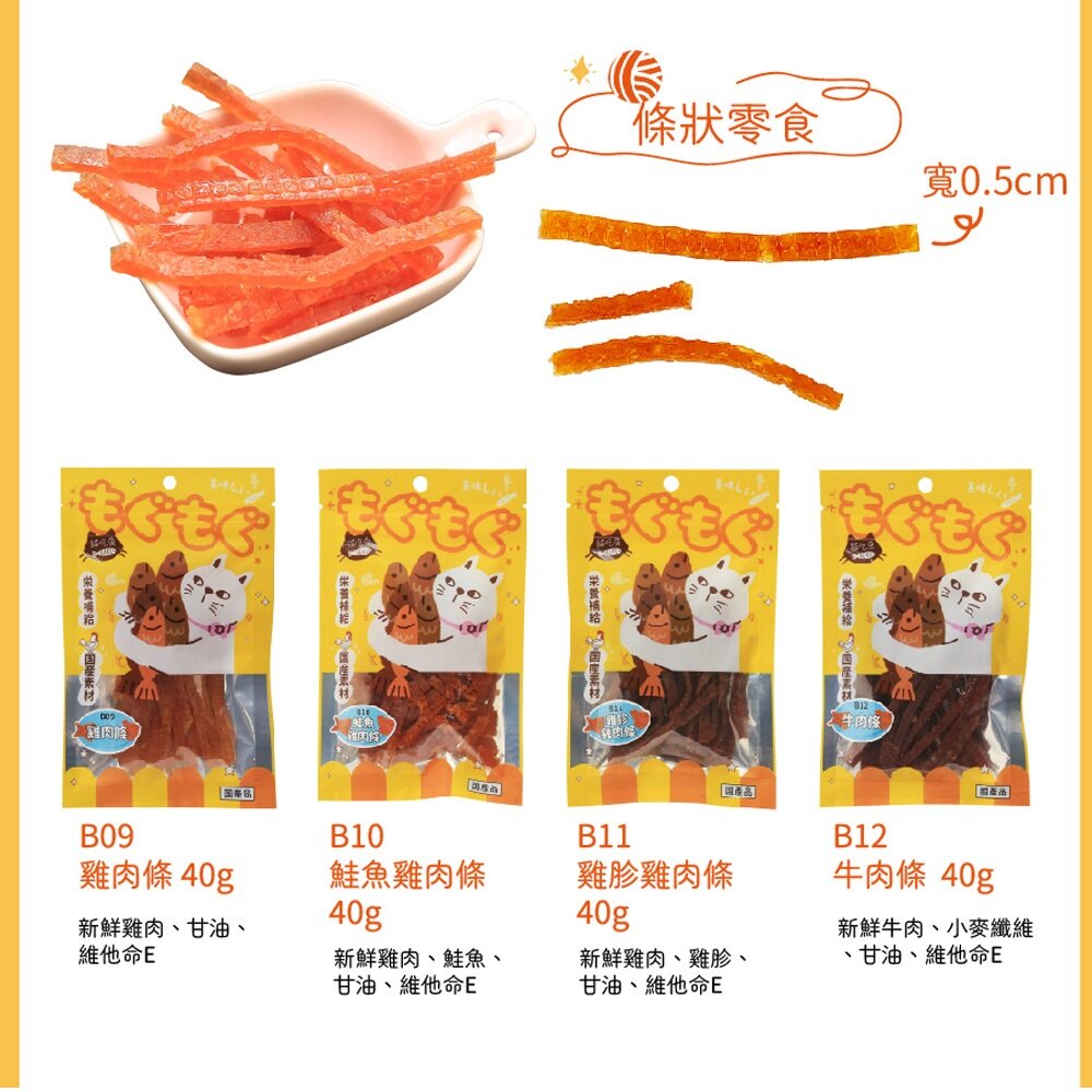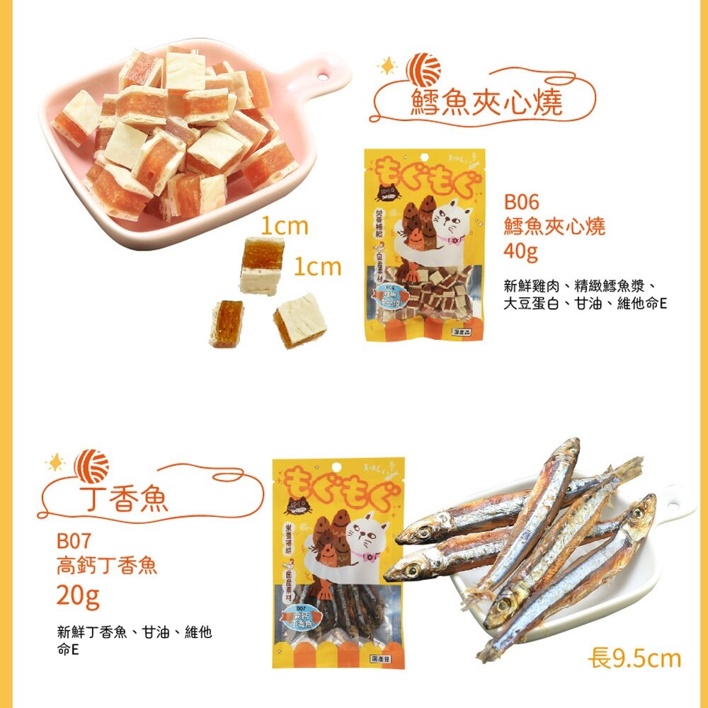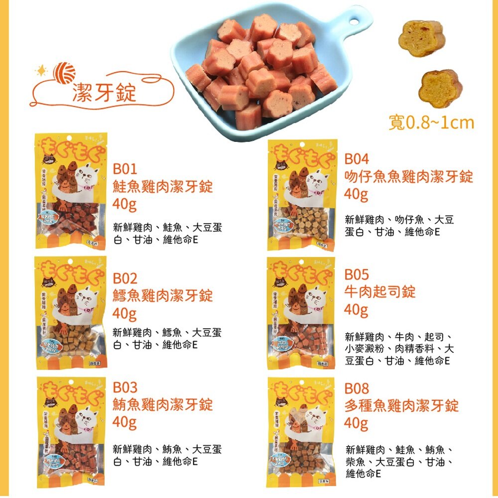 規格(超取限重5公斤):B01鮭魚雞肉潔牙錠40g, B02鱈魚雞肉潔牙錠40g, B03鮪魚雞肉潔牙錠40g, B04吻仔魚雞肉潔牙錠40g, B05牛肉起司錠40g, B06鱈魚夾心燒40g, B08多種魚雞肉潔牙錠40g, B13雞肉粒40g, B14鮭魚雞肉粒40g, B15鱈魚雞肉粒40g, B16牛肉粒40g, B21丁香魚野菜結牙錠40g, B24開胃海鮮鬆20g