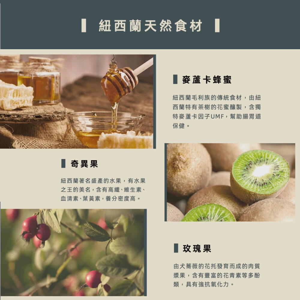 雞肉、雞肉粉、豌豆、木薯、雞脂肪(以維生素E混合保存)、啤酒酵母、亞麻仁籽、天然香料、氯化鉀、氯化膽鹼、硫酸鎂、魚油、蔓越莓乾、奇異果、麥盧卡蜂蜜、玫瑰果乾萃取物、維生素A、維生素D3、維生素E、維生素B1、核黃素、維生素B5、維生素B3、維生素B6、維生素B9、維生素B12、硫酸亞鐵、硫酸銅、硫酸錳、硫酸鋅、碘酸鈣、亞硒酸鈉、維生素K1、硫酸鈷、牛磺酸、維生素B7、丙酸鈣、硫酸軟骨素、葡萄糖胺、綠茶萃取物、迷迭香萃取物、留蘭香萃取物。