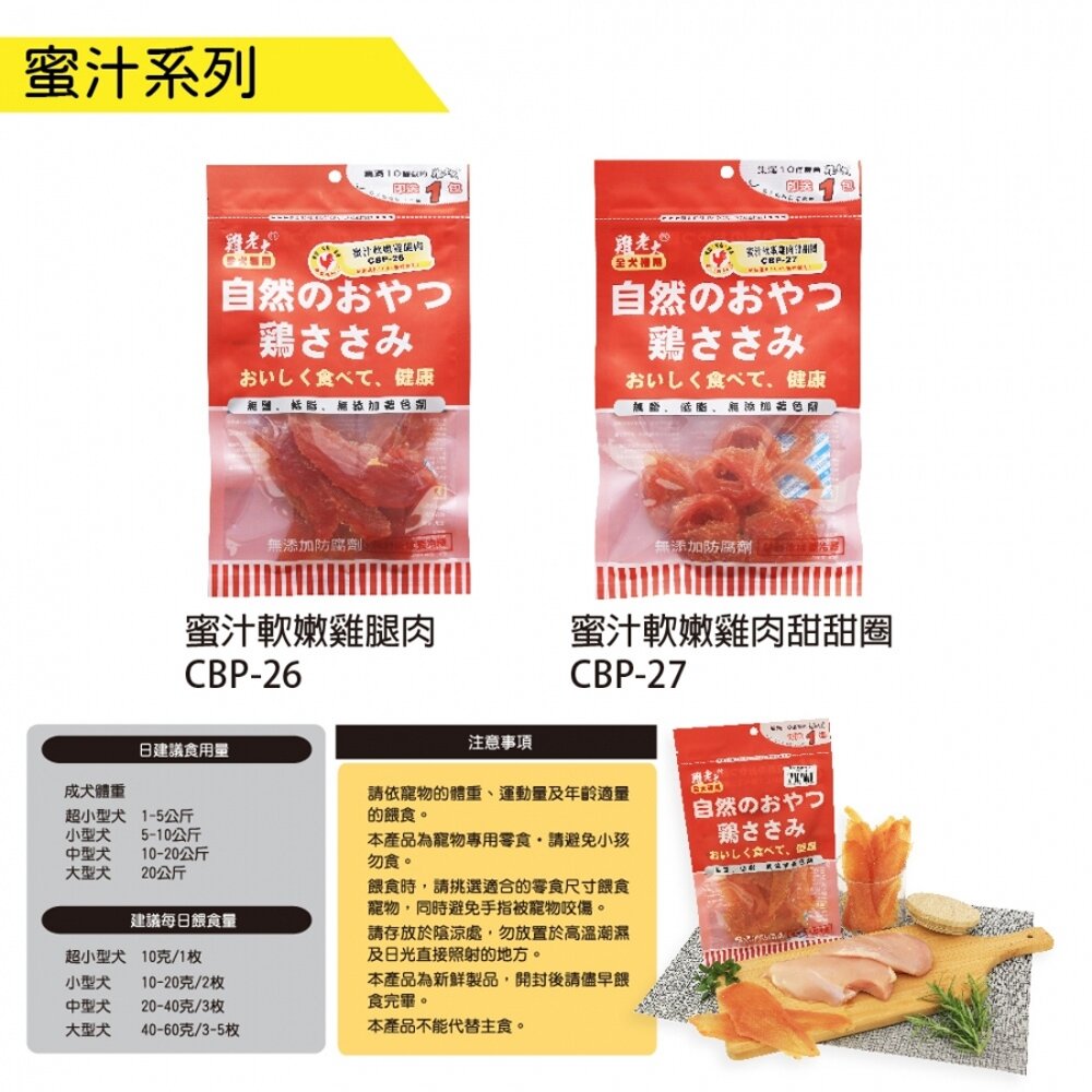 規格:CBP03照燒雞腿肉120g, CBP04燻香薄切雞胸肉120g, CBP07照燒黃金腿肉絲130g, CBP11耐咬雞柳條120g, CBP13爆毛雞肉圓片165g, CBP14膠原羊肉圓片165g, CBP15健腸牛肉圓片165g, CBP16芝麻方塊酥140g, CBP23軟嫩雞腿肉絲120g, CBP25軟嫩雞肉嚼片120g, CBP26蜜汁軟嫩雞腿肉115g, CBP28骰子牛140g, CBP29雞肉丁140g, CBP57羊肉丁130g, CBP31鱈魚雞肉三明治140g, CBP52起司香煎雞肉絲120g, 超值包 02燻香薄切雞胸肉片275g, 超值包 04照燒雞腿肉260g, 超值包 05照燒黃金腿肉絲275g, 超值包 09軟嫩雞腿肉絲280g, 超值包 11軟嫩雞胸肉嚼片270g, 超值包 12蜜汁軟嫩雞腿肉270g, 超值包 13骰子牛340g, 超值包 15雞肉丁(超值包) 340g