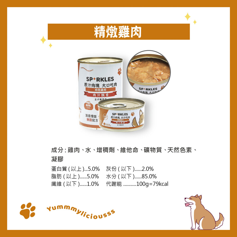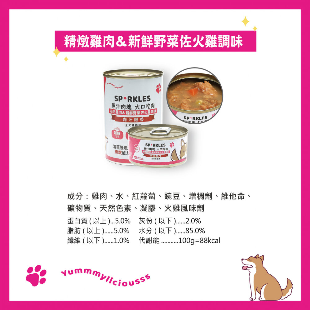 成分:雞肉、水、紅蘿蔔、豌豆、增稠劑、維他命、礦物質、天然色素、凝膠、火雞風味劑