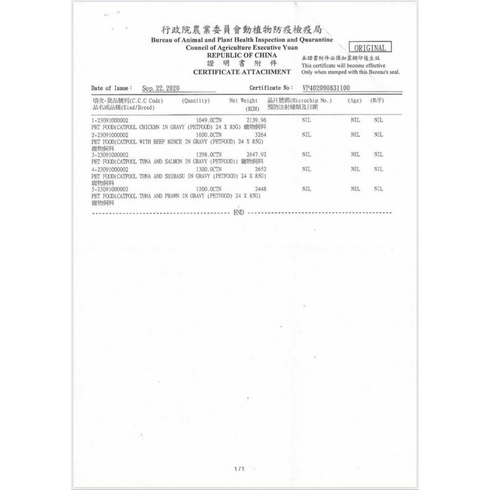 營養標示:可代謝能量40卡、粗蛋白質9%以上、粗脂肪0.5%以上、粗纖維1%以下、水分87%以下、灰分1%以下。