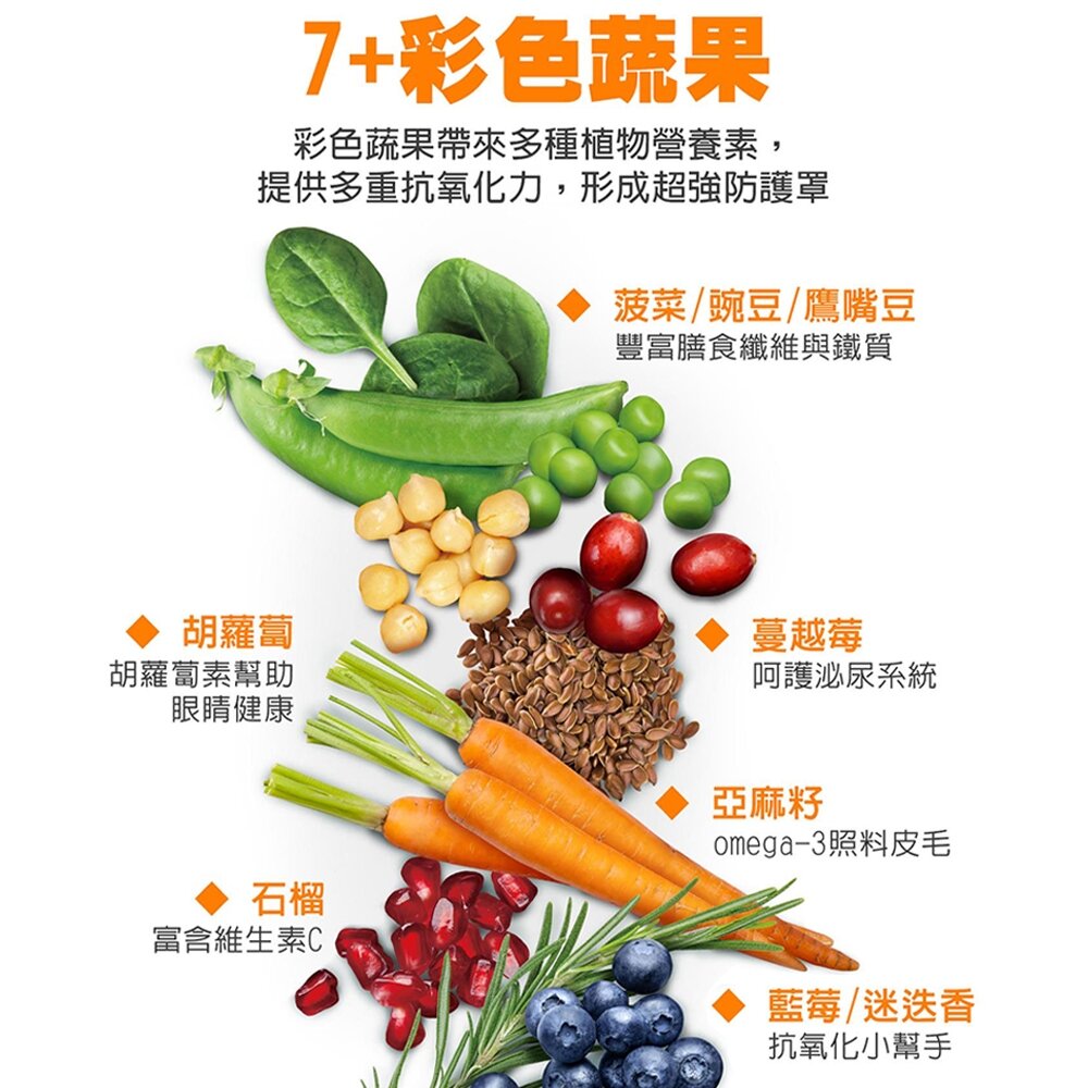 脫水火雞肉、乾豌豆、豌豆粉、乾扁豆、雞脂肪(用混合生育酚保存)、乾鷹嘴豆、亞麻籽粉、豌豆澱粉、乾甜菜漿、天然香料、磷酸鈣、氯化鈉、鮭魚油(用混合生育酚保存)、啤酒酵母、乾燥番茄粕、牛磺酸、菊糖、氯化膽鹼、維生素(維生素 E、L-抗壞血酸-2-聚磷酸鹽(維生素 C 來源)、維生素 B3、泛酸鈣、維生素 A、維生素 B1、維生素 B2、β-胡蘿蔔素、維生素 B12、生物素、維生素 B6、維生素 D3、葉酸)、碳酸鈣、礦物質(硫酸亞鐵、鋅蛋白、鐵蛋白、硒酵母、氧化鋅、硫酸銅、錳蛋白、銅蛋白、氧化錳、碘酸鈣)、DL-蛋氨酸、乾燥石榴、乾燥菠菜、乾燥胡蘿蔔、乾燥蘋果、乾燥甘薯、乾燥藍莓、乾燥蔓越莓、絲蘭提取物、迷迭香提取物、BC30TM 芽孢乳酸菌、腸球F菌、乾酪乳桿菌、嗜酸乳桿菌、雙叉雙歧桿菌。