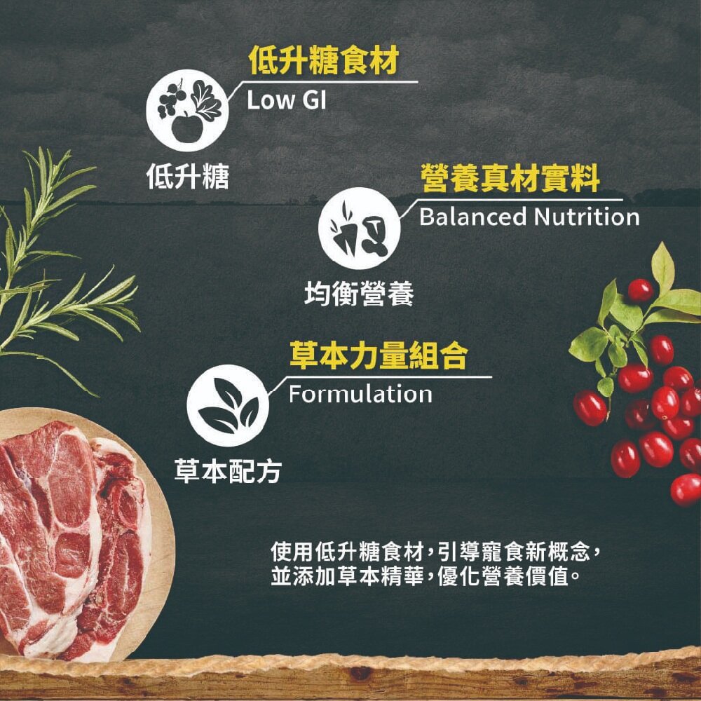 雞肉粉、鮭魚粉、去骨雞肉、燕麥、糙米、雞脂肪(以混合生育酚保存)、珍珠麥、扁豆、豌豆、脫水苜蓿粉、鮭魚油、天然雞肉香料
