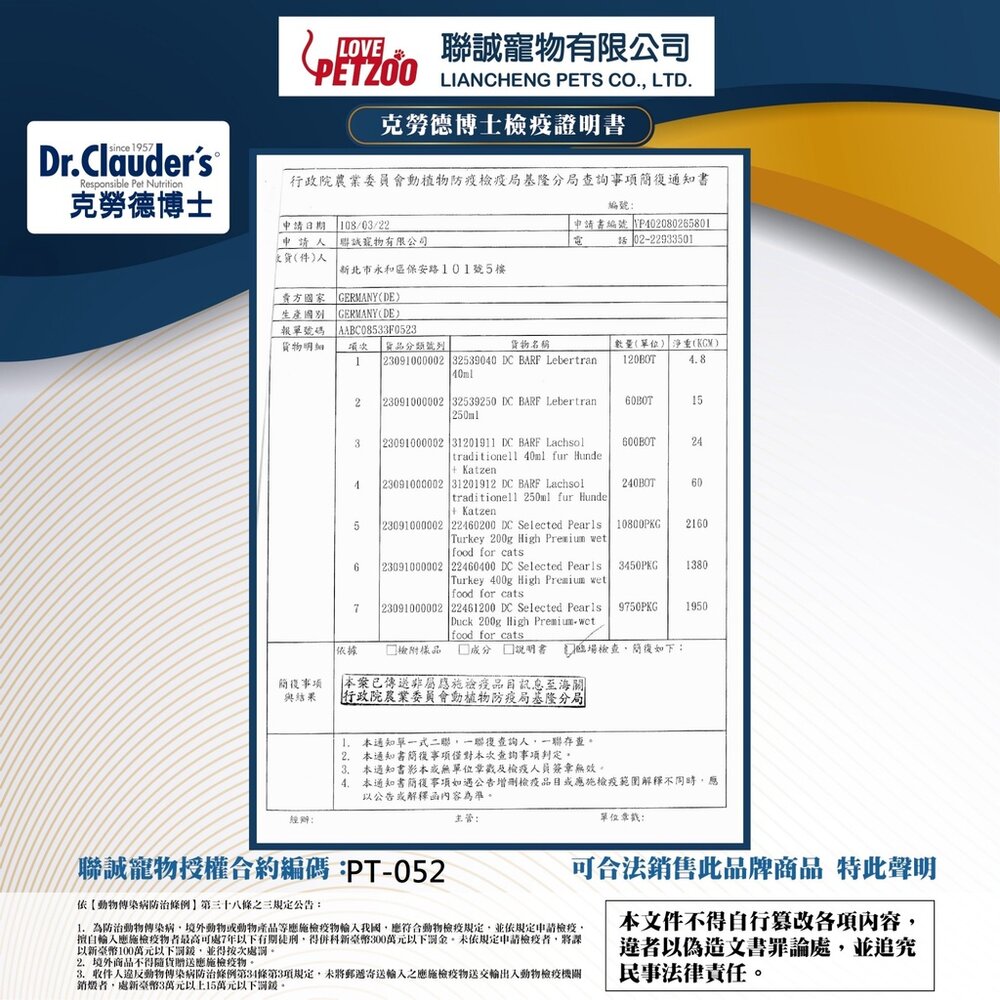 營養添加物(每公斤):牛磺酸5000mg、維生素A 12000IU、維生素D3 980IU、維生素E 60mg、維生素C 28mg
