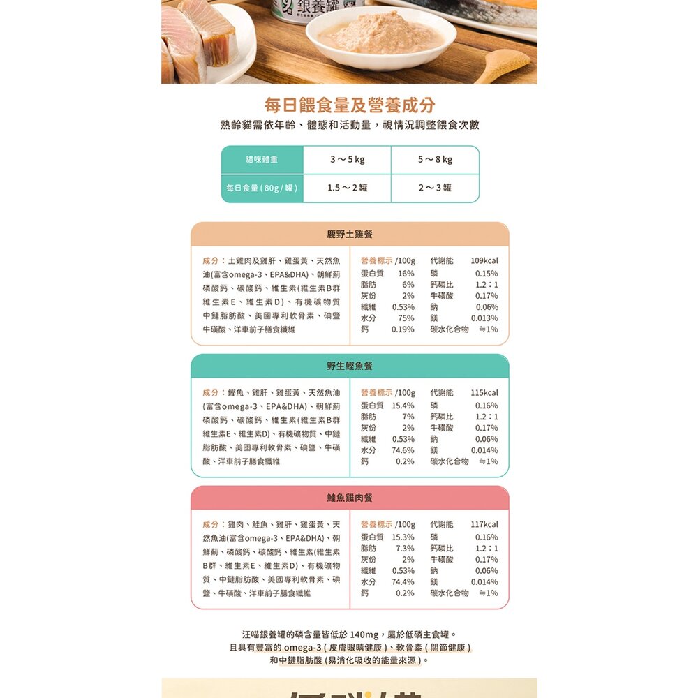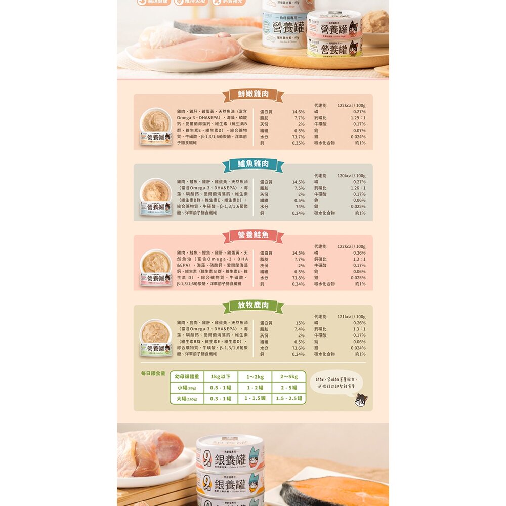 規格(超取限重5公斤):98%鮮肉80g 低敏鴨肉, 98%鮮肉80g 田園火雞, 98%鮮肉80g 鰹魚蝦仁, 98%鮮肉80g 扁鱈雞肉, 98%鮮肉80g 放牧鹿, 98%鮮肉80g 草飼牛肉, 挑嘴80g 鮭魚鰹魚, 挑嘴80g 鯖魚雞肉, 挑嘴80g 秋刀魚雞肉, 低脂80g 清爽雞肉泥, 低脂80g 虱目魚鰹魚, 低脂80g 元氣草飼牛, 低脂80g 健康嫩雞肉, 低磷80g 營養青花魚, 低磷80g 虱目魚魷魚, 銀養80g 鹿野土雞, 銀養80g 野生鰹魚, 銀養80g 鮭魚雞肉, 營養罐80g 鮮嫩雞, 營養罐80g 鱸魚雞, 營養罐80g 營養鮭魚, 營養罐80g 放牧鹿肉, 點心罐80g 鰹魚蛤蜊, 點心罐80g 鮭魚燴嫩雞, 點心罐80g 鮪魚綠貽貝, 點心罐80g 雞絲小蚌貝, 點心罐80g 雞丁燉南瓜, 點心罐80g 嫩雞絲, 清燉雞魚湯 80g, 鮮甜鰹魚湯 80g, 98%鮮肉165g 低敏鴨肉, 98%鮮肉165g 田園火雞, 98%鮮肉165g 鰹魚蝦仁, 98%鮮肉165g 扁鱈雞肉, 98%鮮肉165g 山野鵪鶉, 98%鮮肉165g 放牧鹿, 98%鮮肉165g 草飼牛肉, 挑嘴165g 鮭魚鰹魚, 挑嘴165g 鯖魚雞肉, 挑嘴165g 秋刀魚雞肉, 營養罐160g 鮮嫩雞, 營養罐160g 鱸魚雞, 點心罐160g 鰹魚蛤蜊, 點心罐160g 鮭魚燴嫩雞, 點心罐160g 鮪魚綠貽貝, 點心罐160g 雞絲小蚌貝, 點心罐160g 雞丁燉南瓜, 點心罐160g 嫩雞絲