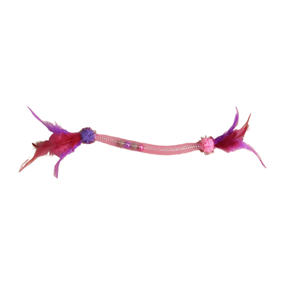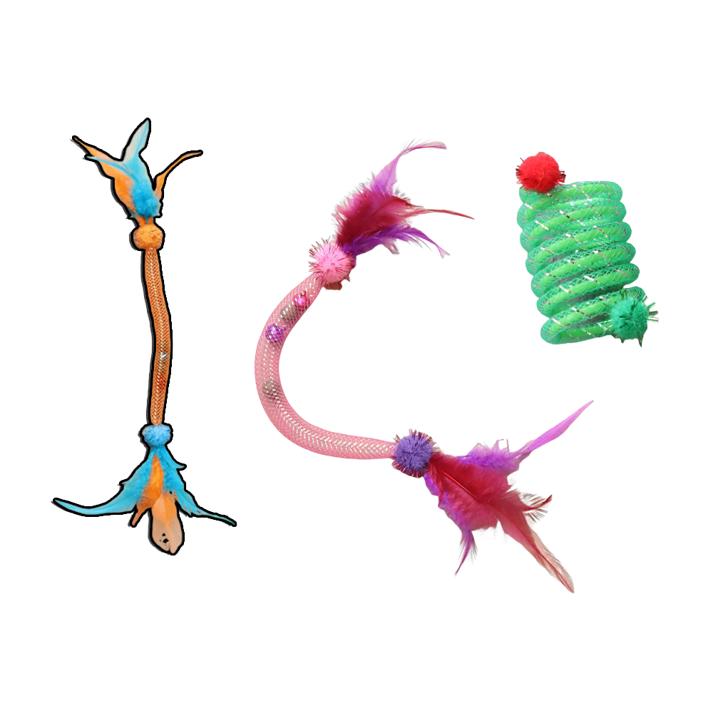 色彩繽紛的彈力網管搭配羽毛、鈴鐺與貓薄荷球,